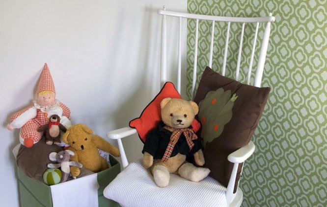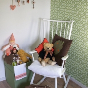 Wonen voor jou heeft ons Retro behang bloem Olijf gebruikt als neutrale basis kleur, waaraan later jongens of meisjes accessoires toegevoegd kunnen worden.