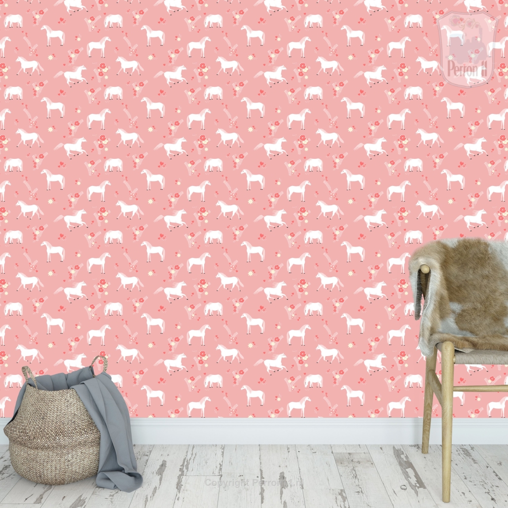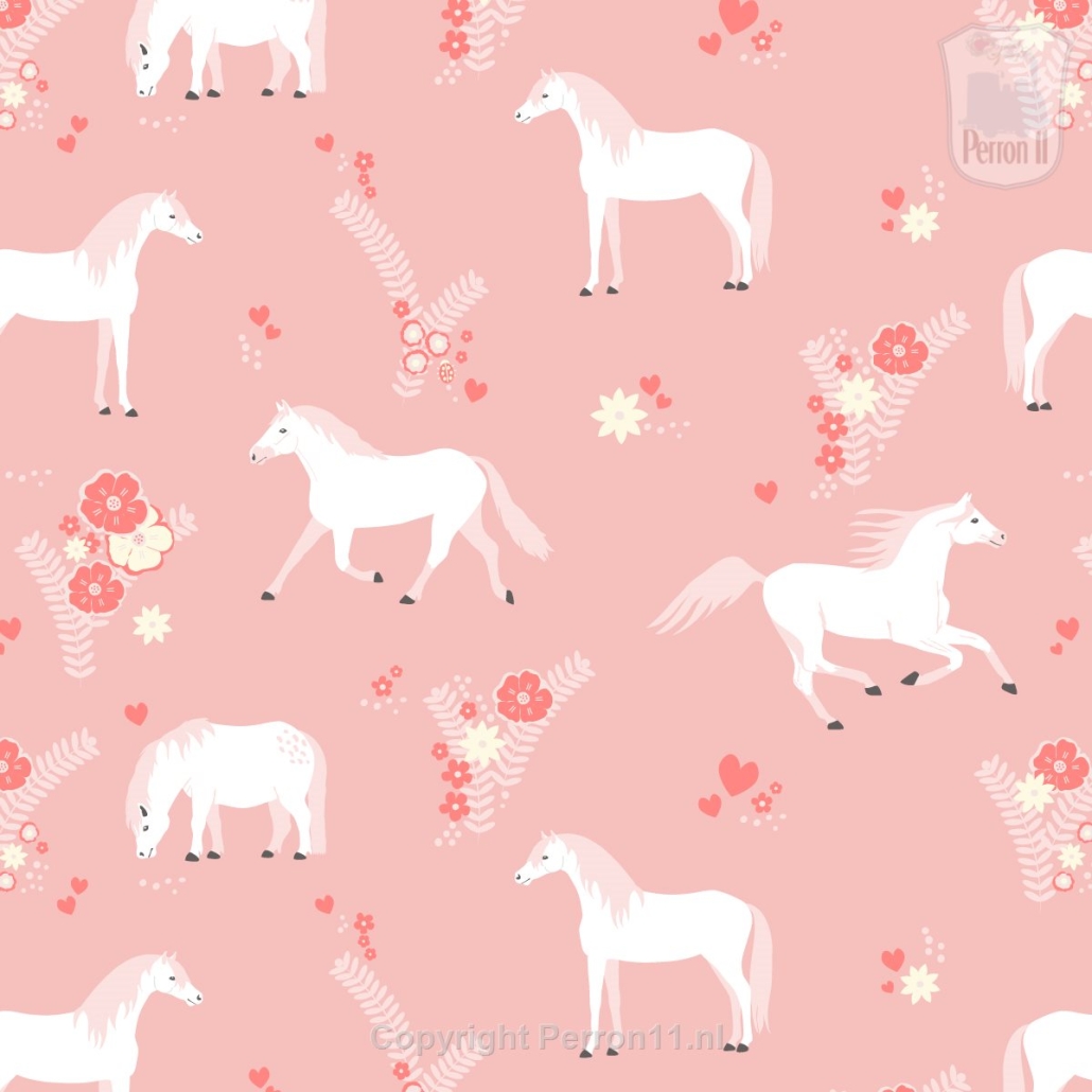 Dit mooie behang met paarden in een wei is super leuk in de meisjeskamer! Het behang is roze met witte paarden en donkerder roze bloemetjes. Een vrolijk dessin voor echte paardenmeisjes!