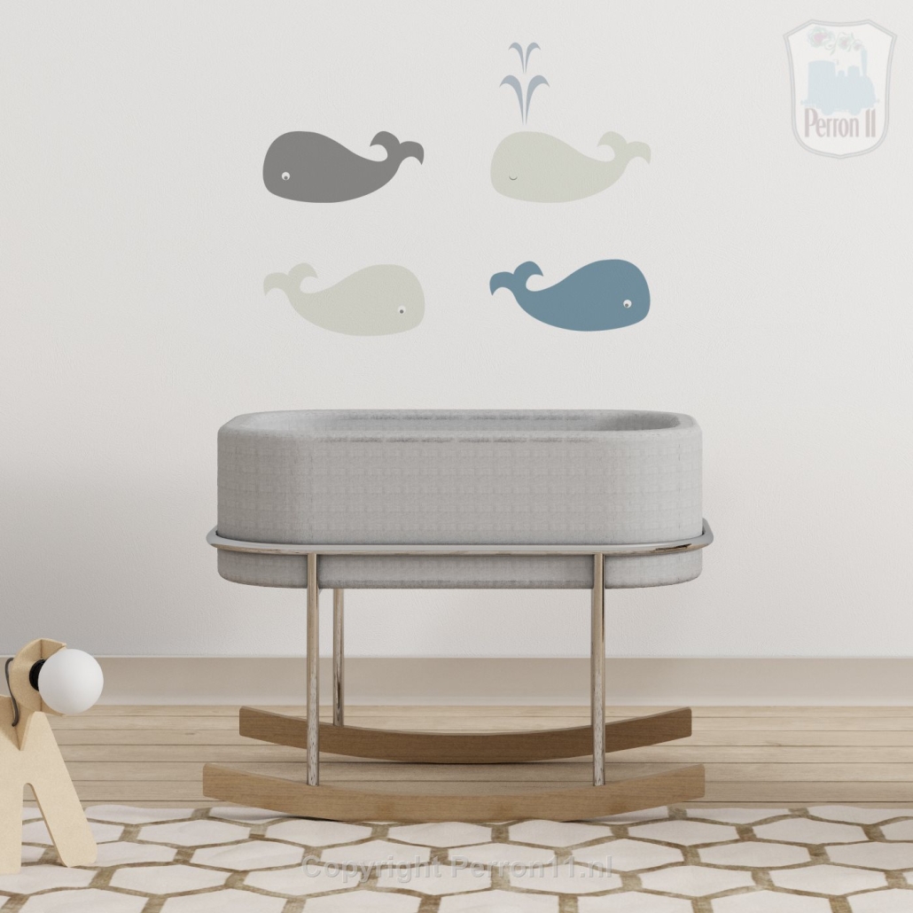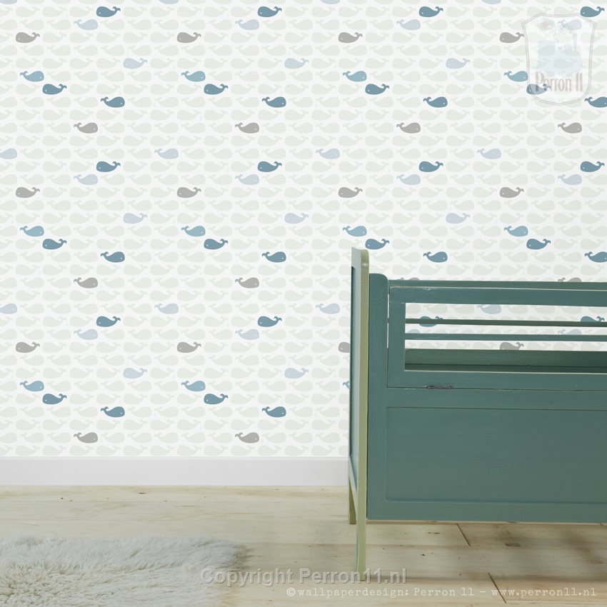 Zie je deze walvisjes al dobberen in de babykamer of jongenskamer? Met dit walvisbehang in de hippe kleur mint en het stoere denim blauw maak je de kinderkamer helemaal eigentijds.