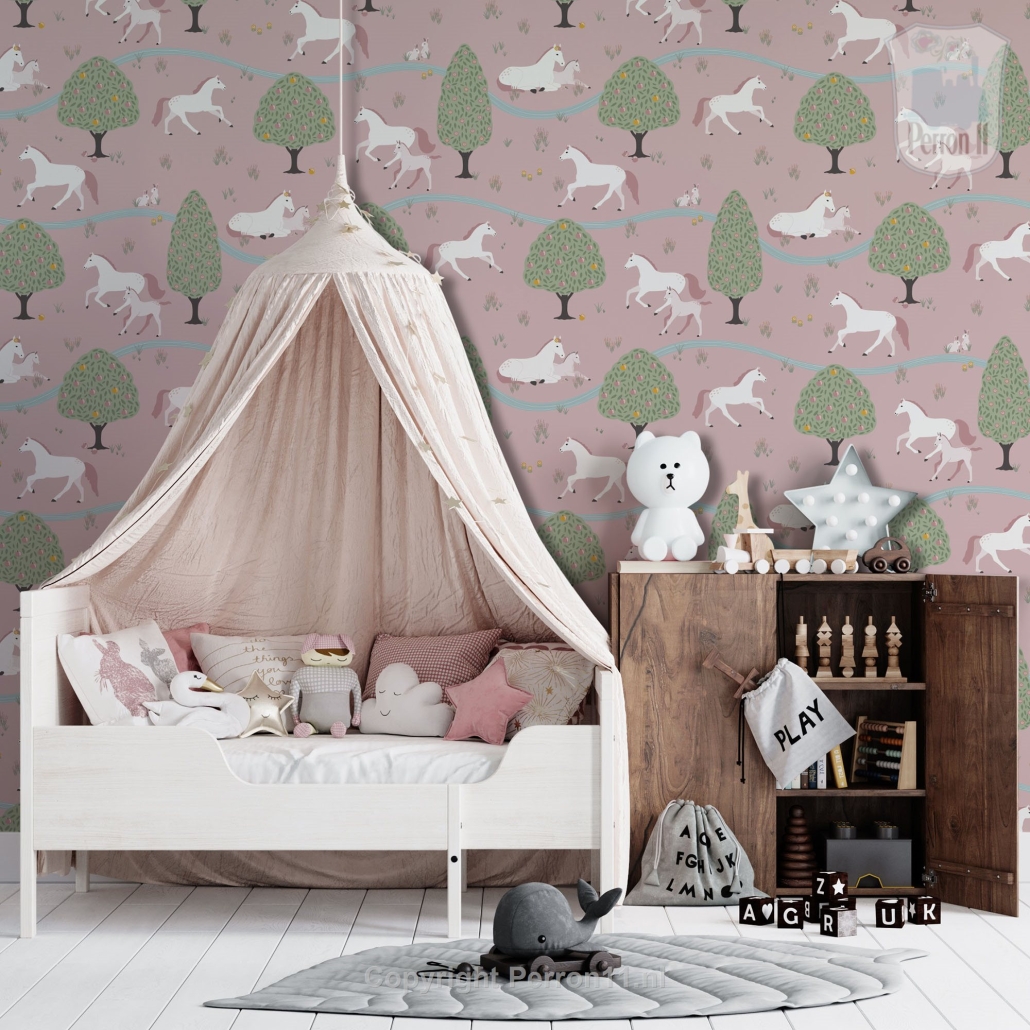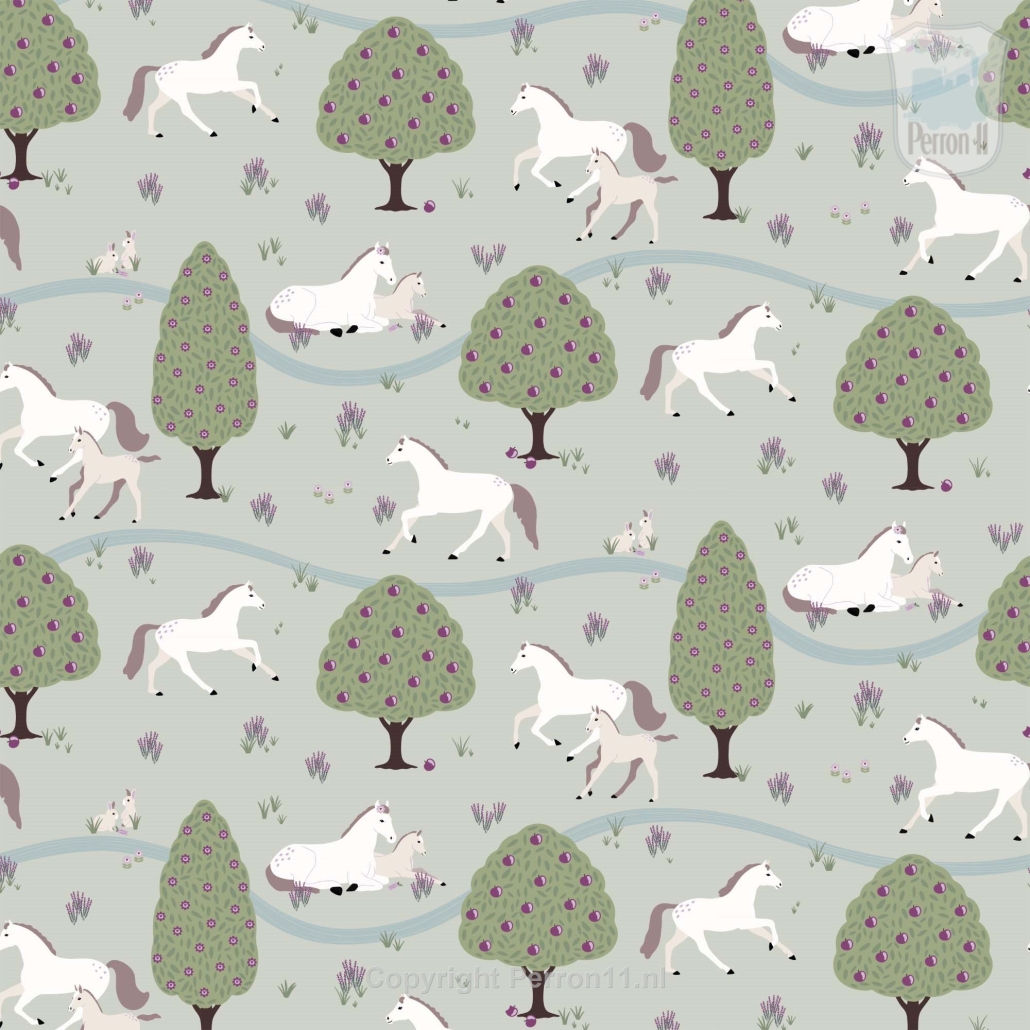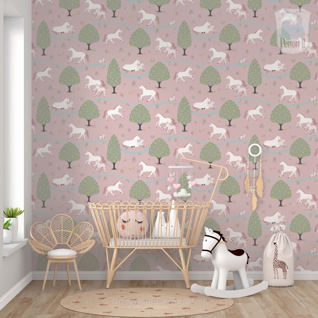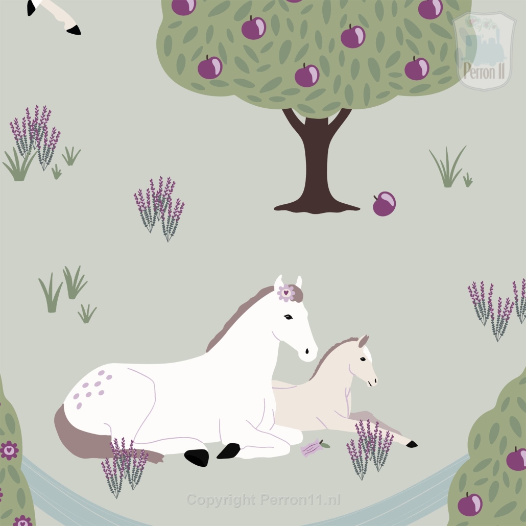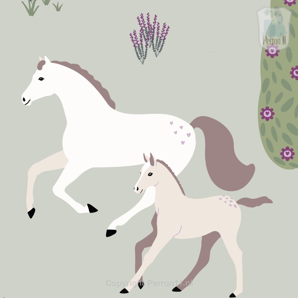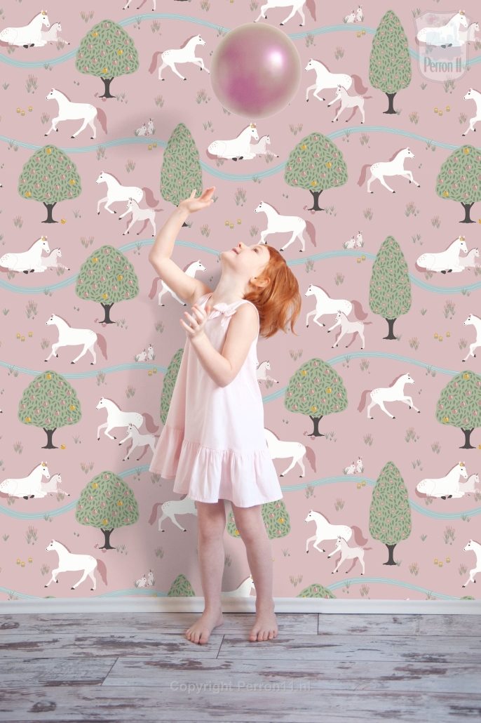 Jouw paardenmeisje vindt dit behang met paarden Happy Horses vast geweldig in haar kamer. Op het behang staan verschillende paarden en veulens die heerlijk tussen de bomen over de velden galopperen. Sommige paarden liggen samen met hun veulen even lekker uit te rusten aan een riviertje. Op dit paarden behang staan allerlei subtiele details die je pas ontdekt als je lang genoeg naar het behang kijkt. Het behang met paarden is verkrijgbaar met een zacht mintgroene achtergrond (groen) en met een oud roze achtergrond (roze). Op een rol paardenbehang zitten 4 gescheiden banen van elk 270 cm hoog x 50 cm breed. Daarmee behang je dus een stuk wand van maximaal 270 x 200 cm (hxb). Elke volgende rol sluit uiteraard naadloos aan. Wil je een lambrisering maken van dit paardenbehang? Bestel dan een speciale rol voor lambrisering. Daarop zitten 8 banen ven elk 135 cm hoog en 50 cm breed. Eén paardje is ongeveer 12x15 cm (hxb).