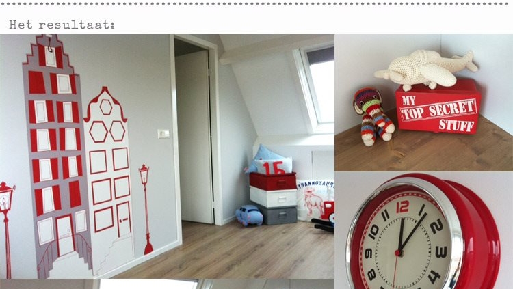 Twee kamertjes op zolder moesten samen één grote zolderkamer worden. Kinderkamerstylist maakte een advies met als basiskleuren rood, grijs en wit. Om hierop aan te sluiten paste ik voor deze opdracht de grachtenpandjes behangfiguren aan in deze kleurstelling, aan de hand van enkele Histor-verfstalen. Onder de schuine wanden is een ruime maatwerkkast geplaatst met in het midden een bureau met een blad van hout. Heel praktisch en leuk voor Thomas om aan te spelen! Op de kastenwand kwam een schoolbordsticker van KEK Amsterdam.