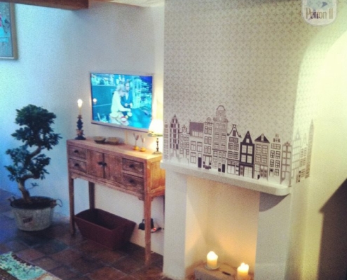 Een van onze klanten was eigenlijk op zoek naar porseleinen beeldjes van Amsterdamse grachtenpandjes voor op de schouw, maar stuitte in zijn zoektocht op ons grachtenpandjesbehang. En…