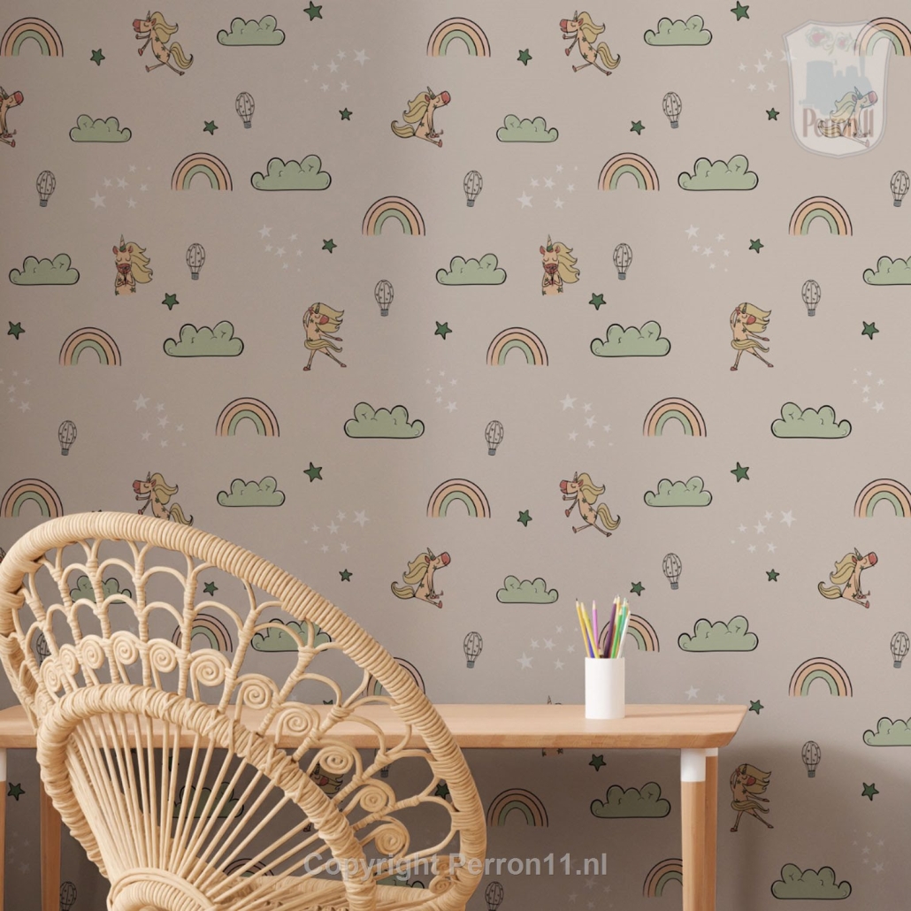 Dit speelse eenhoornbehang Unicorn met grappige eenhoorns, regenboogjes, luchtballonnen, wolken en sterren geeft jouw meisjeskamer een magisch sfeertje! Gastontwerpster Merel Post ontwierp het speciaal voor Perron 11 en je kunt het combineren met andere vrolijke designs uit deze collectie. Natuurlijk kun je het ook alleen gebruiken, bijvoorbeeld om 1 wand een echte wow-factor te geven! Wil je het behang combineren met een bijpassend design? Scroll dan helemaal naar onder om te zien hoe je dit behang kunt mixen en matchen!
