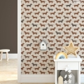 Dol op honden of teckels? Dan is dit toffe honden behang met teckels wat voor jouw kinderkamer! Het is verkrijgbaar in vier kleurstellingen: oud roze met aardetinten (roze), denimblauw met groen (blauw), mintgroene ton-sur-ton tinten (mint) en bruin met beige (bruin). Elk hondje op het behang is ongeveer 9 x 5 cm (breedte x hoogte). Op een rol zitten 4 aparte banen van elk 50 cm breed x 270 cm hoog. Met 1 rol behang je dus een vlak van 200 x 270 cm (bxh). Wil je een lambrisering maken van dit hondenbehang? Bestel dan een speciale rol voor het maken van een lambrisering.