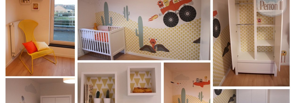Vooraf had de klant goed nagedacht welke meubels waar zouden komen en alles opgemeten. Aan de hand van een tekening konden wij de aangepaste compositie van het behang daarop aanpassen. Ook was een van haar wensen om de binnenzijde van de kledingkast te bekleden met het patroon van de heuvels. Een mini-muursticker van monster Neo in de kast, maakten het plaatje compleet. De accessoires in dezelfde kleuren zoals de gele stoel, het stoffen vliegtuigje, de cactusjes en de gele schoentjes maken de kamer verder helemaal af.