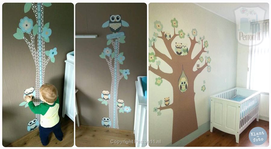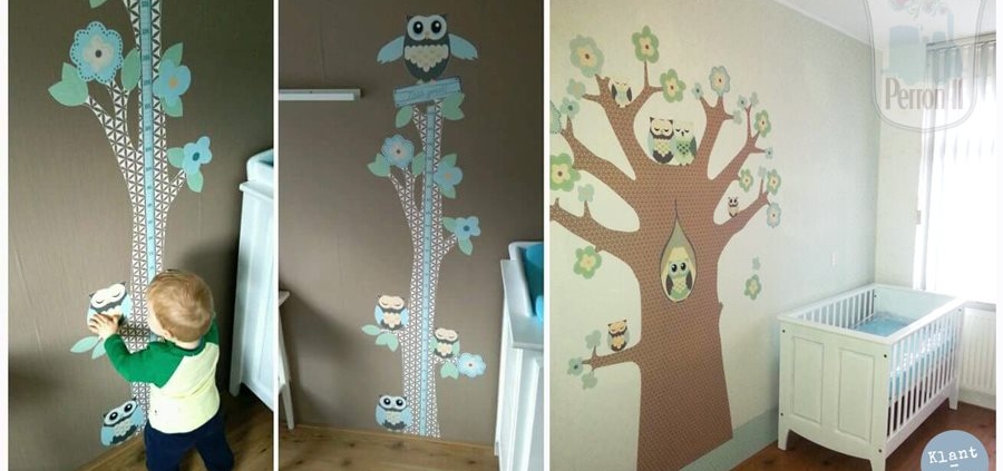 Toen Anke op zoek ging naar behang voor de kinderkamer, stond het min of meer al vast dat het iets met uilen moest worden. Het posterbehang ‘Familie Uil met sterrenhemel’ was liefde op het eerste gezicht. Twee jaar later zocht Anke een bijpassende groeimeter, en ook die vond ze bij Perron 11.