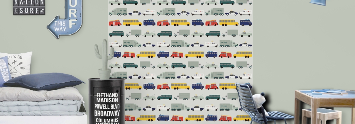 Onze behangrollen met patroon bestaan uit 4 losse banen van elk 50 cm breed die precies op elkaar aansluiten. 1 Rol kun je dus gebruiken als een behangpaneel van 200 cm breed. Plak de 4 banen in het midden van de wand en schilder de wand aan beide kanten in een bijpassende kleur. De verfkleur op de eerste foto hierboven is Tranquil Dawn van Flexa, een mooie zachte en rustige kleur. Natuurlijk kun je ook voor een iets donkerdere tint gaan, dan krijgt de wand iets meer diepte en sommig behang springt er dan net iets meer uit. Net wat je wilt. Bij dit voertuigenbehang staat bijvoorbeeld ook Early Dew van Flexa mooi, net ietsje donkerder. Zie de foto hieronder.