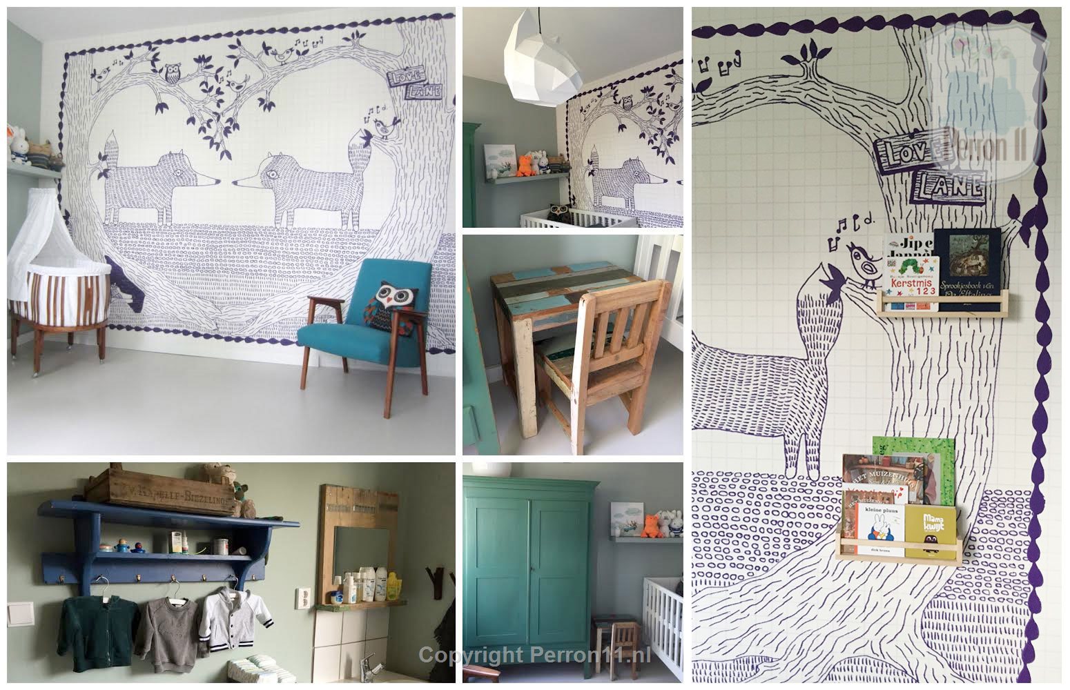Lisette schrijft over de kamer: “Een bijzonder kamertje qua inrichting en uitstraling. De wand met de pentekening is leeg gehouden zodat het optimaal tot z’n recht komt. De doorslag gaf de smaakvol opgehangen bakjes aan de bomen met boekjes. Mooi geïntegreerd in het behang!”