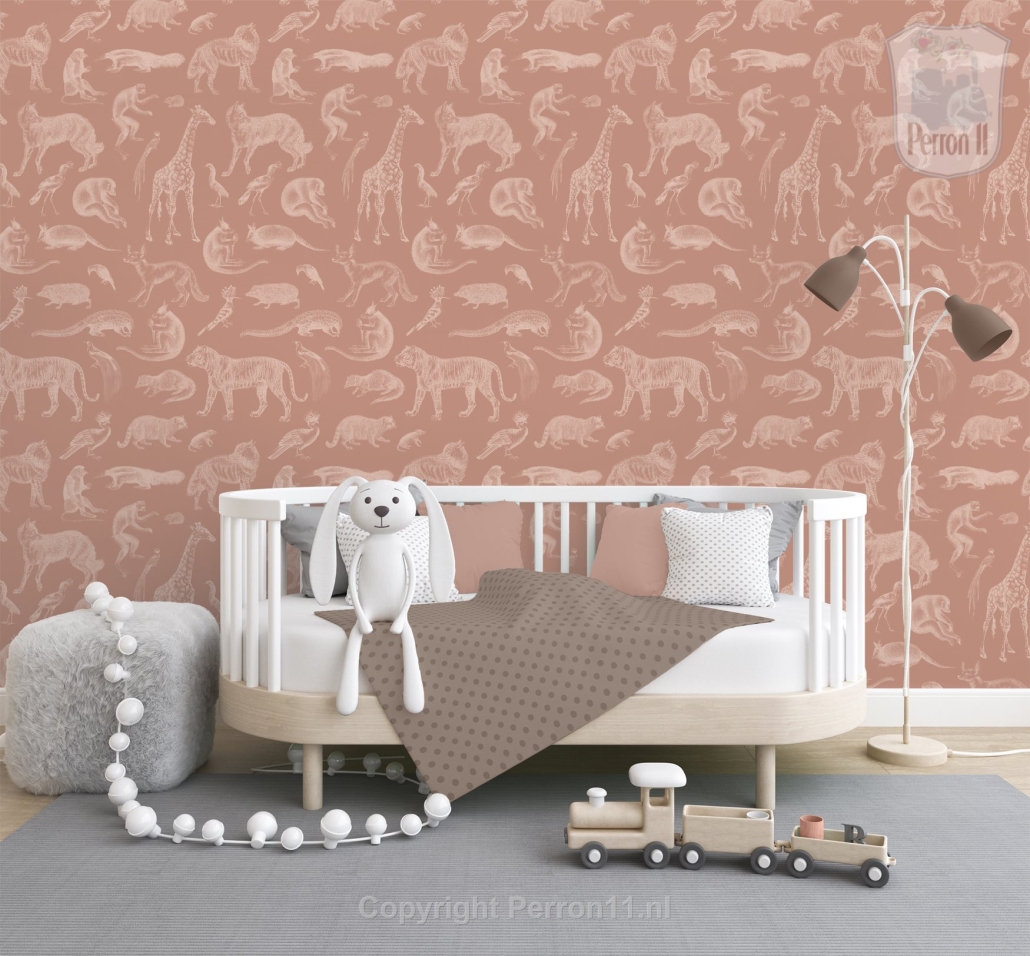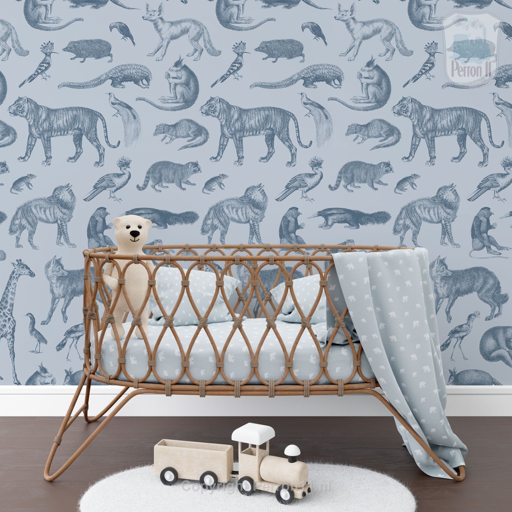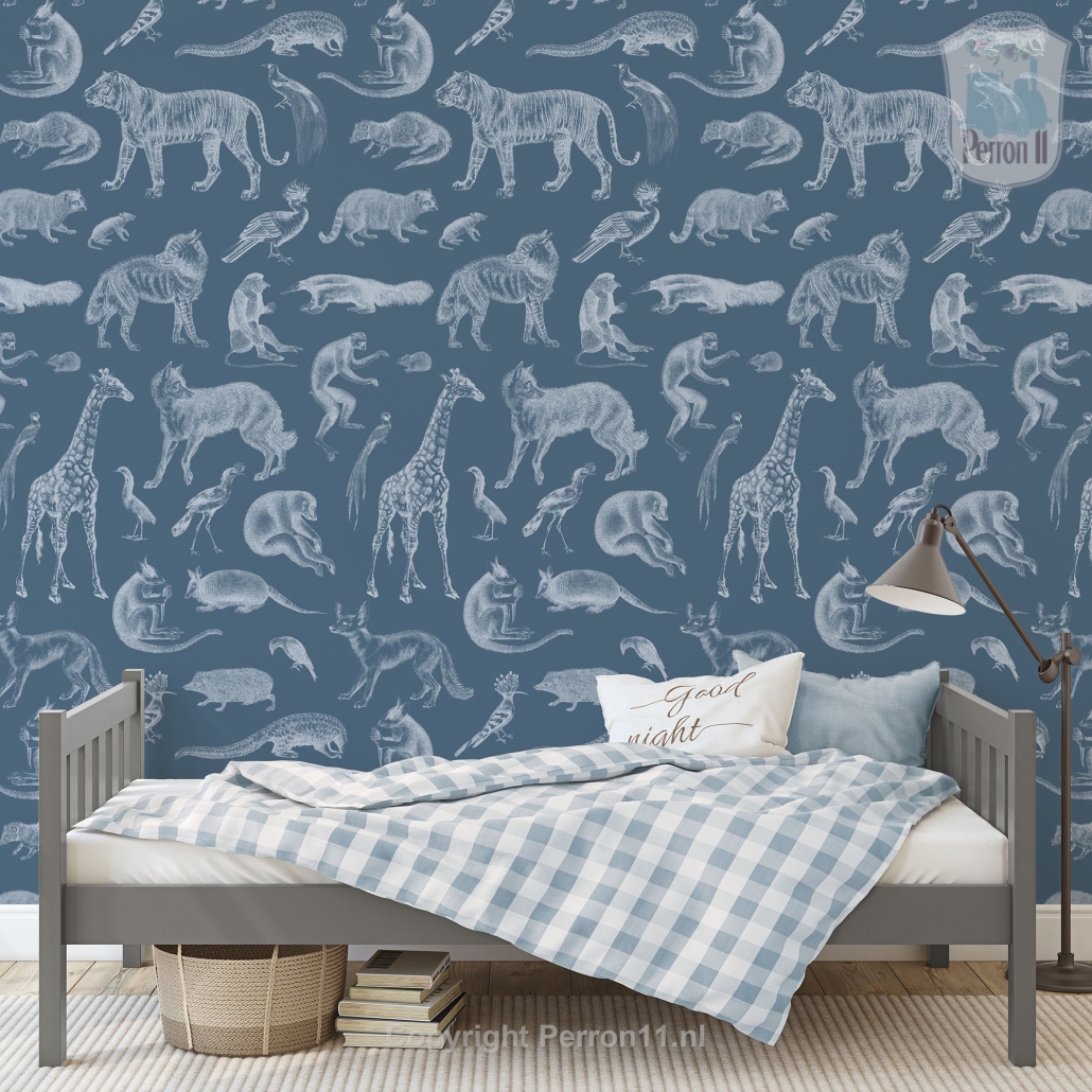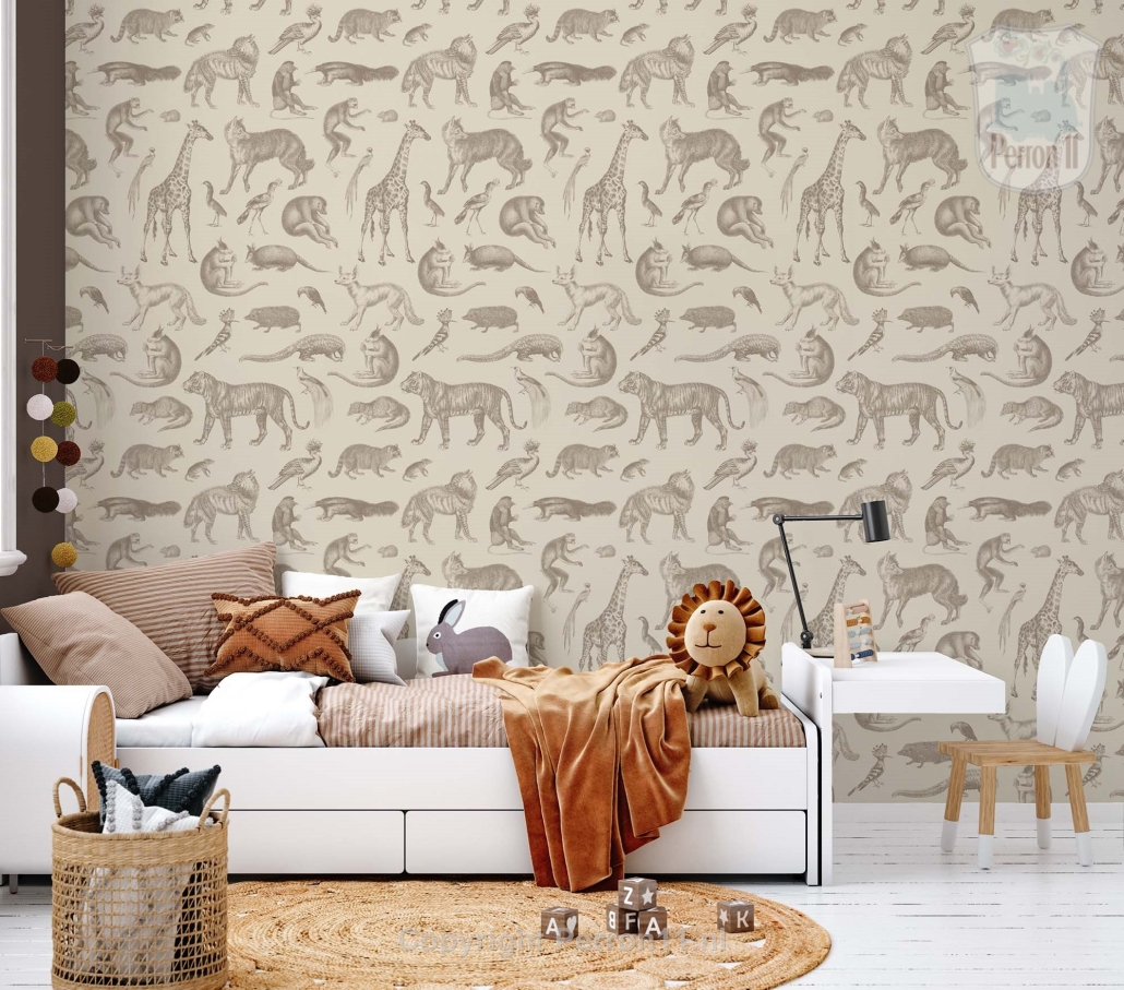 Behang met dieren doet het altijd goed in de kinderkamer! Dit kinderbehang met wilde dieren heeft een patroon met allemaal verschillende en bijzondere jungle dieren en is getekend in vintage stijl. Omdat het behang maar twee kleuren heeft, blijft het lekker rustig terwijl er toch ontzettend veel te ontdekken valt! Zo zie je tijgers, giraffen, vossen, apen, jakhalzen, gordeldieren, vogels en andere dieren die in de jungle thuishoren. Ook fijn: dit behang is leuk voor de babykamer, maar blijft leuk tot +/- de tienertijd. Het gaat dus lekker lang mee! Het is verkrijgbaar in verschillende kleuren. LET OP: de kleur beige is nieuw en daar hebben we helaas nog geen stalen van. Je kunt wel al behangrollen in deze kleur bestellen!