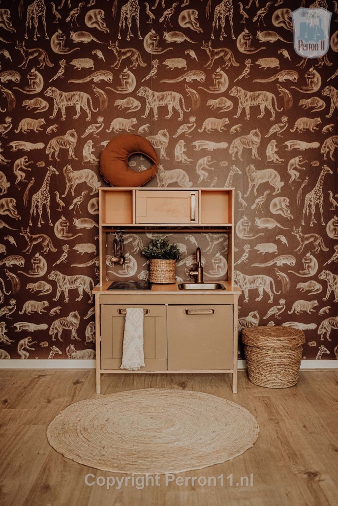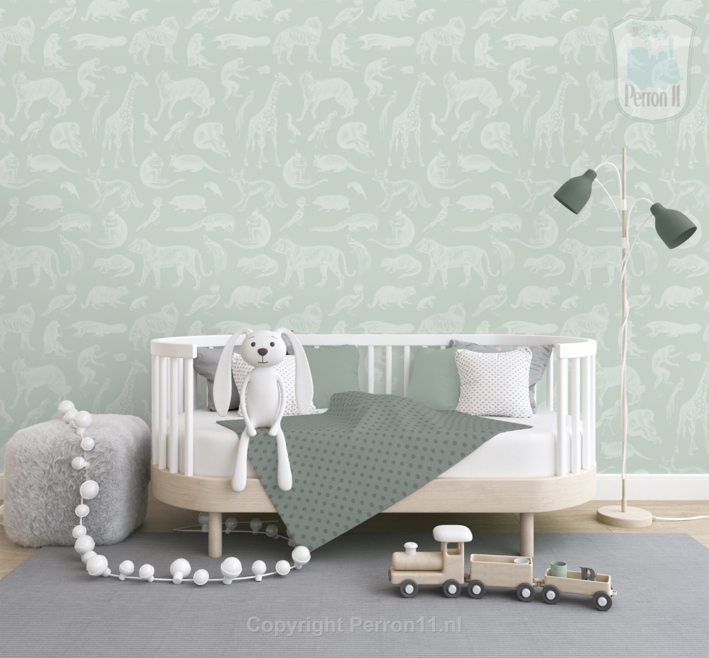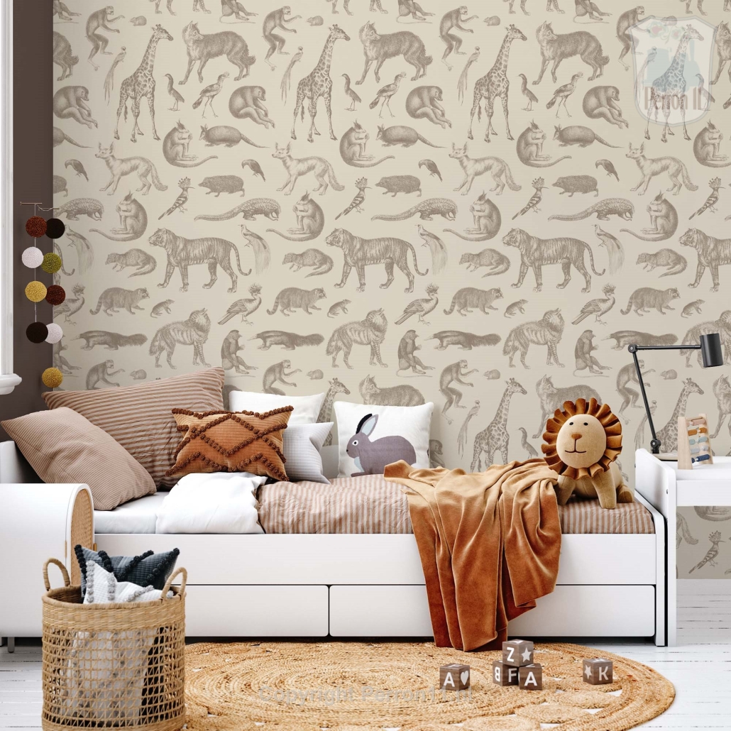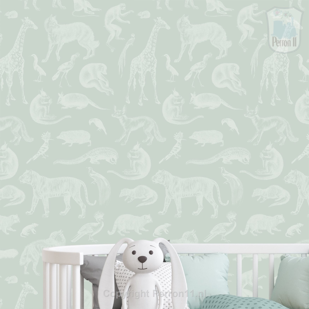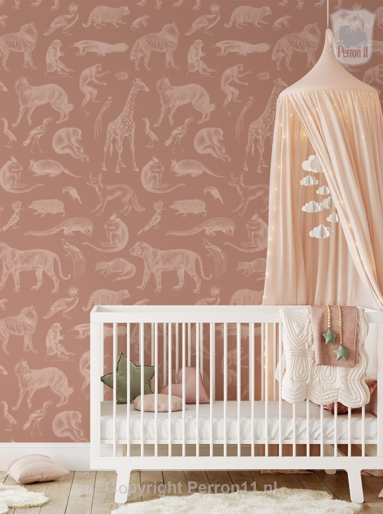 Behang met dieren doet het altijd goed in de kinderkamer! Dit kinderbehang met wilde dieren heeft een patroon met allemaal verschillende en bijzondere jungle dieren en is getekend in vintage stijl. Omdat het behang maar twee kleuren heeft, blijft het lekker rustig terwijl er toch ontzettend veel te ontdekken valt! Zo zie je tijgers, giraffen, vossen, apen, jakhalzen, gordeldieren, vogels en andere dieren die in de jungle thuishoren. Ook fijn: dit behang is leuk voor de babykamer, maar blijft leuk tot +/- de tienertijd. Het gaat dus lekker lang mee! Het is verkrijgbaar in verschillende kleuren. LET OP: de kleur beige is nieuw en daar hebben we helaas nog geen stalen van. Je kunt wel al behangrollen in deze kleur bestellen!