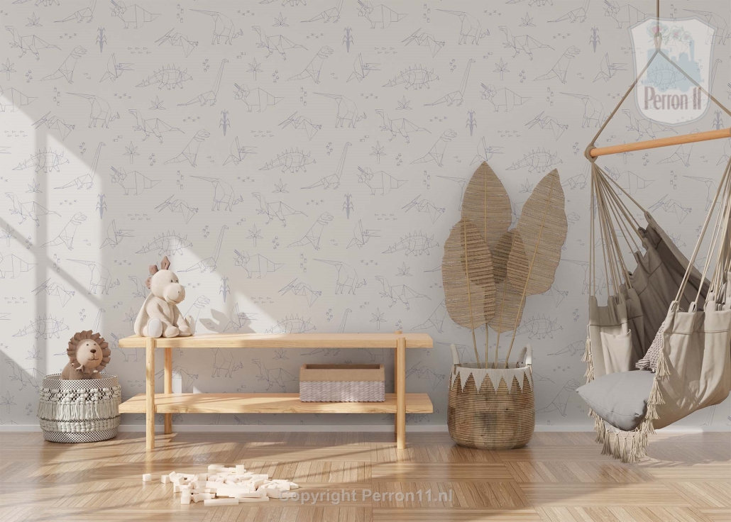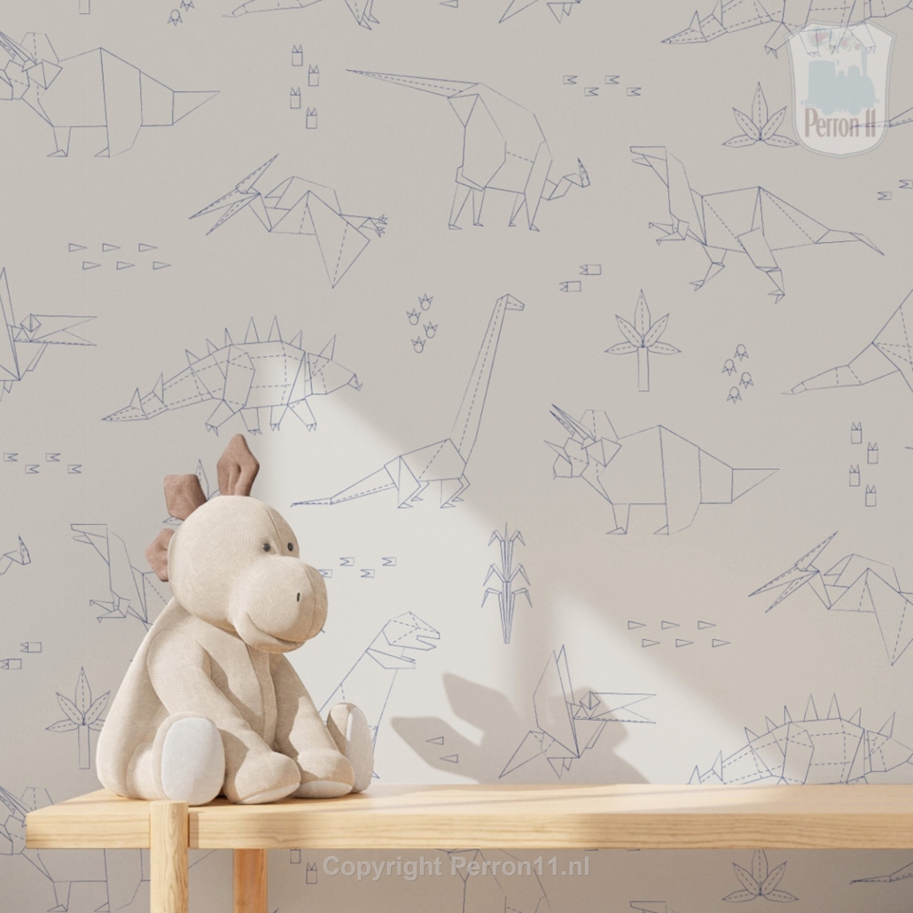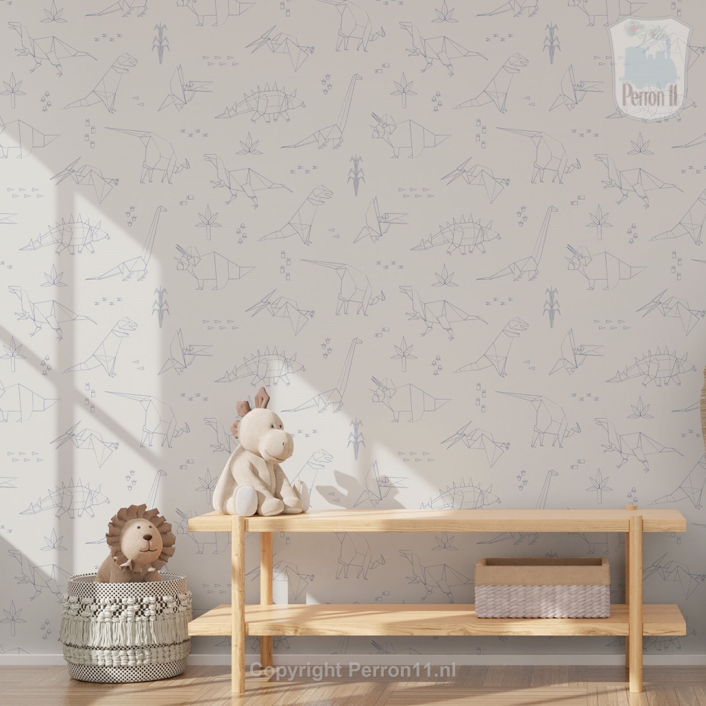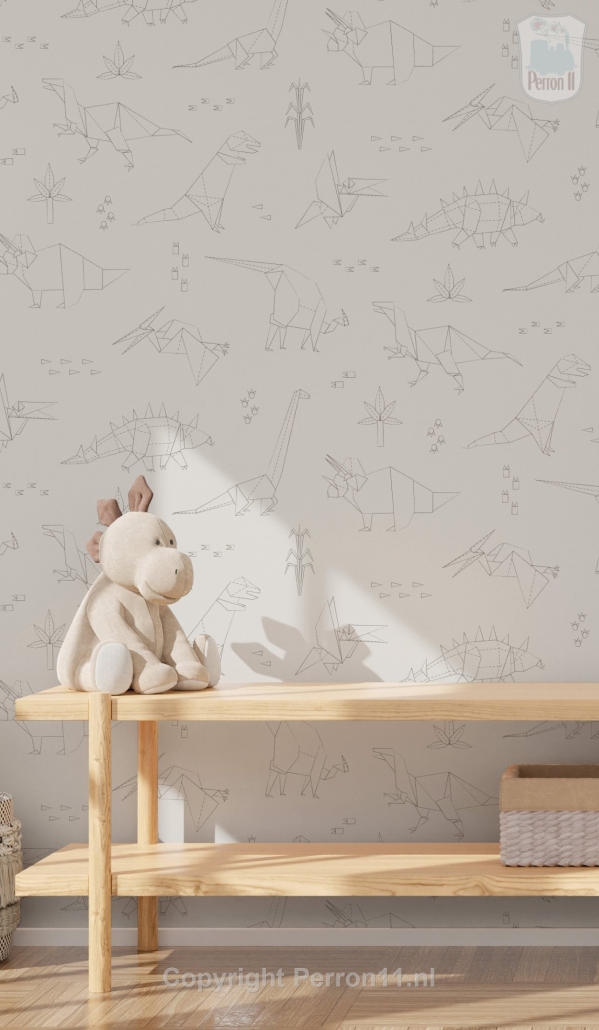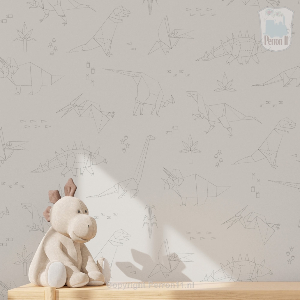 Zoek je een rustig behang voor de kinderkamer waarop toch veel te zien is, dan is dit behang met dinosaurussen in vast wat voor jou! De dino's zijn getekend in een geometrische origami stijl alsof ze uit papier gevouwen zijn. Dat maakt dit dino behang lekker tijdloos: het is leuk voor in de babykamer, maar ook nog voor een stoere jongenskamer of meidenkamer als je kind al wat groter is. Doordat de dino's getekend zijn met vrij dunne lijntjes en het behang een rustige beige of eenkleurige achtergrond heeft, is het behang lekker rustig. En toch valt er een heleboel te ontdekken voor je kind! Want herkent je zoon of dochter de verschillende dino's al? Scrol naar beneden en ontdek welke dino's je allemaal op dit behang vindt! Ook lees je daar meer over de vijf verschillende kleuren waarin dit behang verkrijgbaar is.