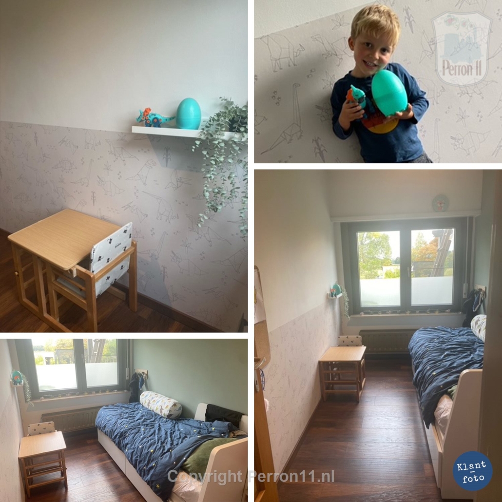 Op dit moment is dit dinobehang in origami stijl verkrijgbaar in vijf verschillende kleuren, nl. in drie verschillende lijnkleuren op een beige achtergrond: blauw, bruin en vergrijsd groen (bestel: groen). Ook is er een versie met donkergroene lijnen op een grijsgroene achtergrond (bestel: donkergroen) en een met lichtroze lijnen op een roze achtergrond. Dit laatste dinobehang is natuurlijk superleuk voor een meisjeskamer! Zit jouw favoriete kleur dinosaurusbehang er niet bij? Dan heb ik goed nieuws: maatwerk is bij ons altijd mogelijk! Vraag gerust naar de mogelijkheden!