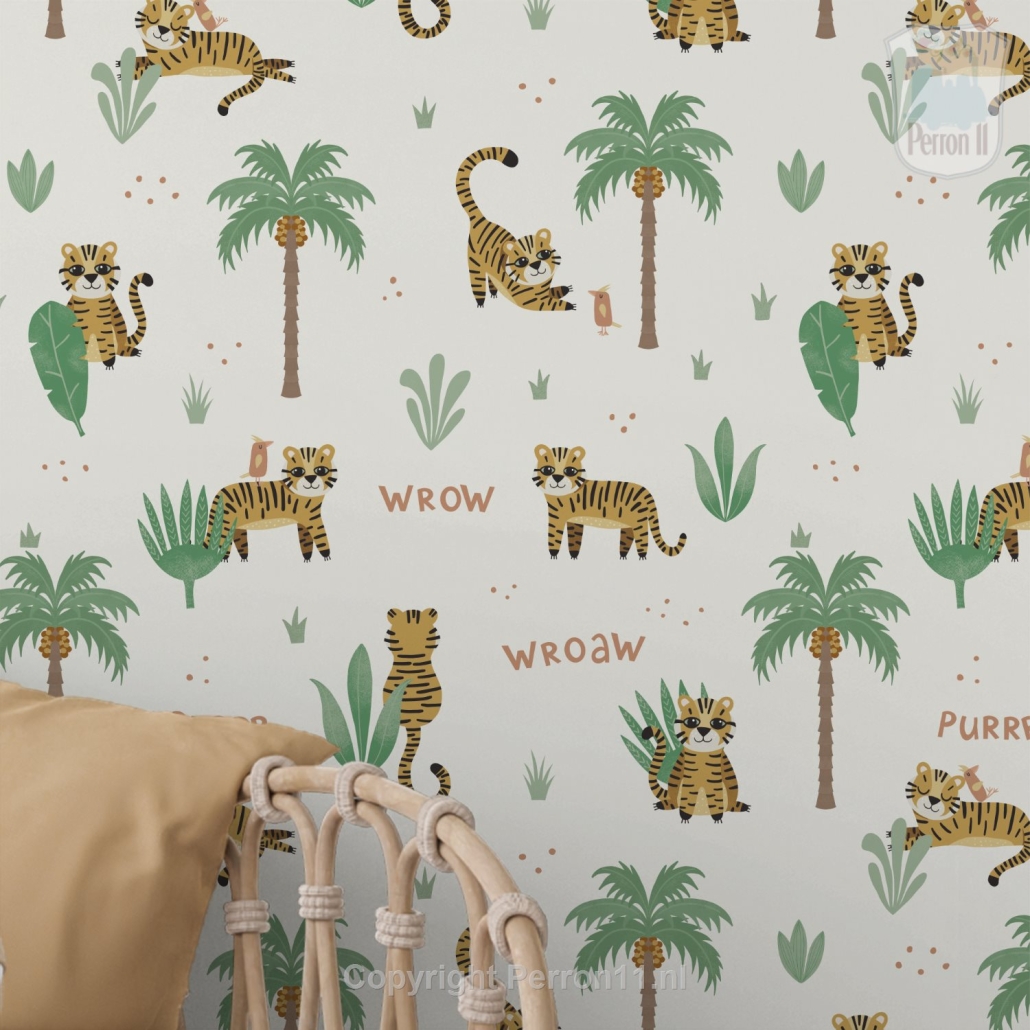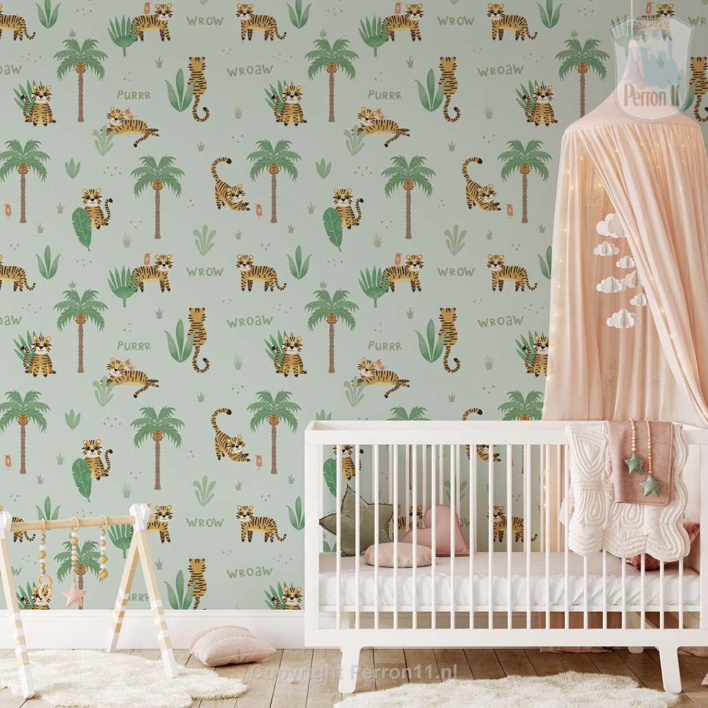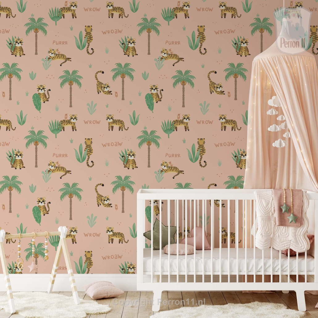 Dit behang met schattige tijgertjes die in de jungle spelen is super leuk voor de babykamer of peuterkamer. Ben jij fan van de jungletrend, maar vind je het meeste behang voor een jungle kinderkamer nog wat te realistisch voor de baby- of peuterkamer? Dan is dit behang echt wat voor jou. De tijgertjes zijn ultra vrolijk en spelen met de grappige vogeltjes. De palmbomen en en andere tropische bladeren geven jouw babykamer toch een fijne jungle look. Je kunt kiezen uit verschillende achtergronden. Ga jij voor een trendy roestkleur, mint of beige - kleurtjes die voor zowel jongens als meisjes leuk zijn en daarmee ook perfect voor een unisex babykamer? Of ga je liever voor een zachter kleurtje, zoals zalm of mint?