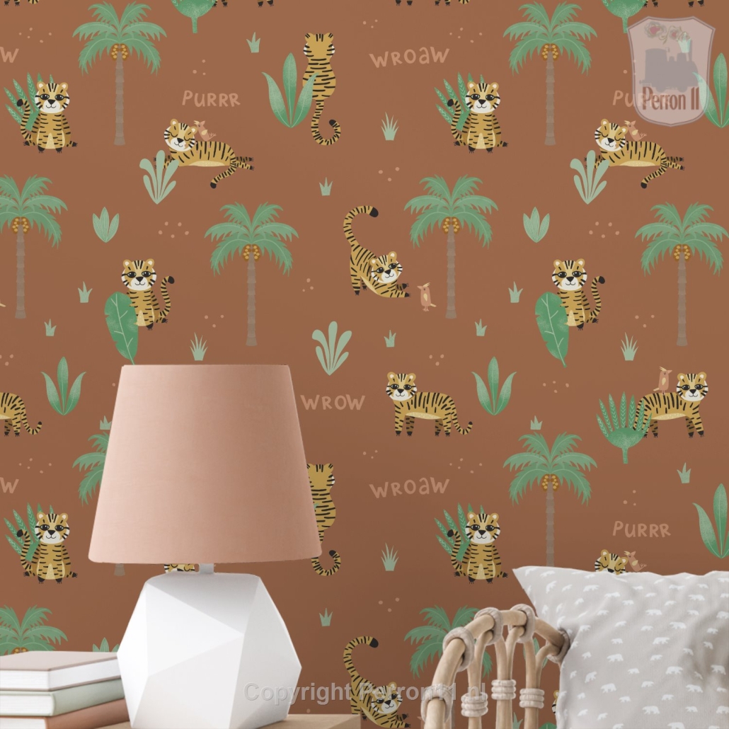 Dit tijger jungle behang plak je heel makkelijk in jouw kindkamer