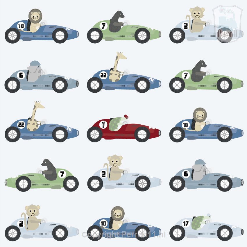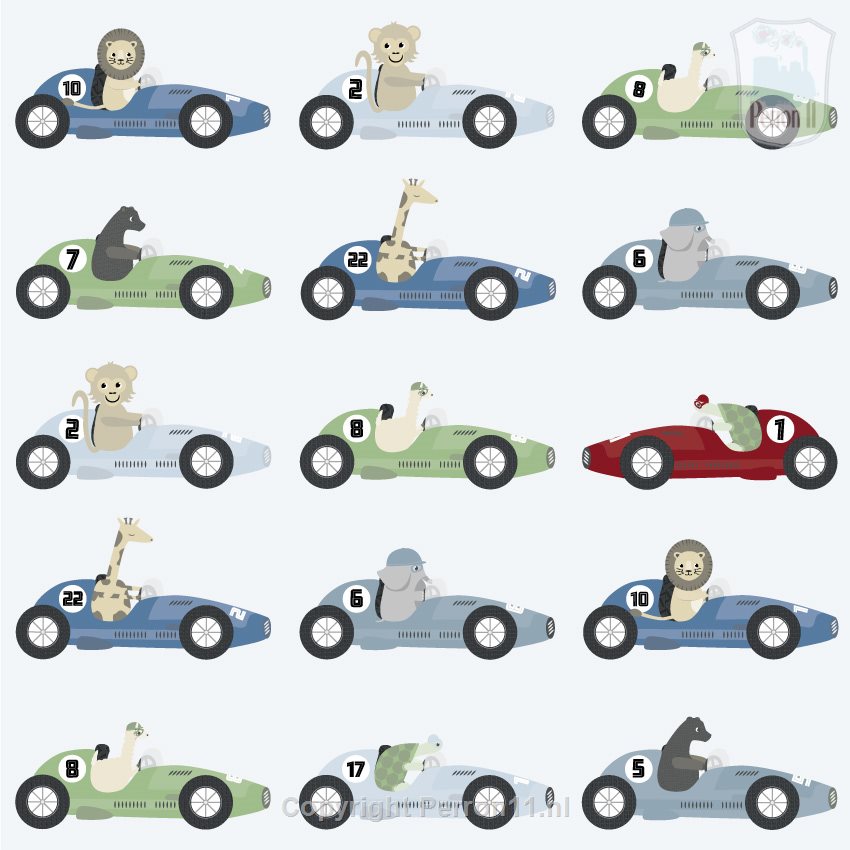 Dit behang met stoere jaren-50 race-auto's maakte ik speciaal voor kleine snelheidsduiveltjes. Maak jij jouw babykamer of peuterkamer helemaal stoere-jongensproef met dit Formule 1 behang? Het behang heeft mooie zachte kleuren zoals denim blauw, grijsblauw, groen op een lichtblauwe achtergrond met hier en daar een rood accent voor een beetje pit. In de race-auto's zitten verschillende dieren, nl. een leeuw, beer, aap, lama, giraf, olifant en een schildpad. Welke dier wint de race op jouw wand?