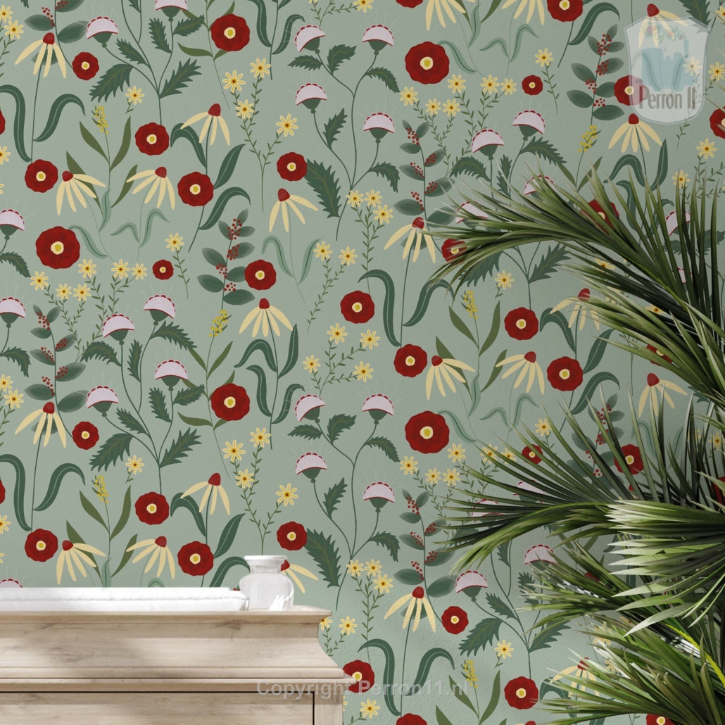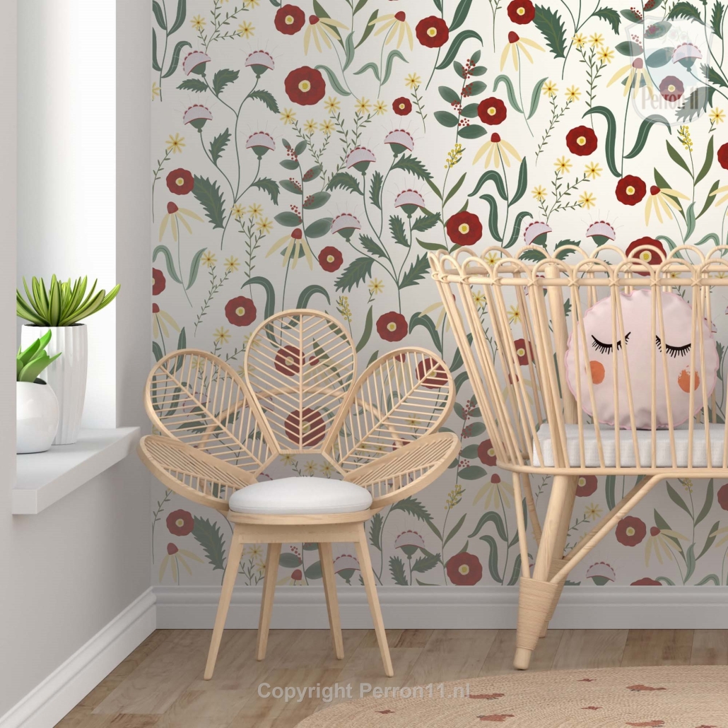 Dit bloemenbehang Klaproos is echt wat voor de meisjeskamer. Of voor in de babykamer van jouw dochter. Het is vrolijk, kleurrijk en echt meisjesachtig zonder super zoet te zijn. Door de verschillende kleuren in het behang kun je het combineren met leuke accessoires. Natuurlijk wil je niet dat de kinderkamer te druk wordt en vraag je je misschien af of dat het niet gaat gebeuren met een wat drukker printje als op dit behang. Maar don't worry: als je 1 wand behangt met dit bloemen behang en de rest van de wanden in een mooie rustige bijpassende kleur schildert valt dat reuze mee. Sterker: één opvallende wand maakt je kinderkamer heel sfeervol en zo wordt het een echte blikvanger. Laat de kraamvisite de babykamer maar zien! Ook leuk: een lambrisering maken van dit behang en daar boven de wand in een mooie rustige kleur schilderen (bijv. een groen uit het behang). Of andersom: het onderste deel van de wand schilderen en daarboven plak je dit bloemetjesbehang. Super mooi!