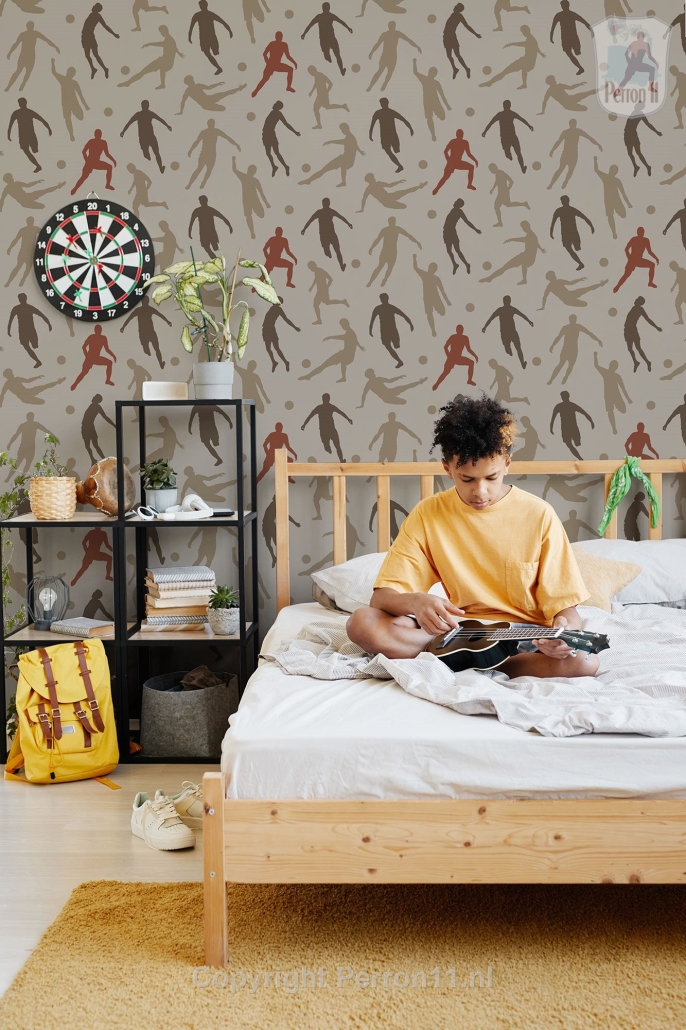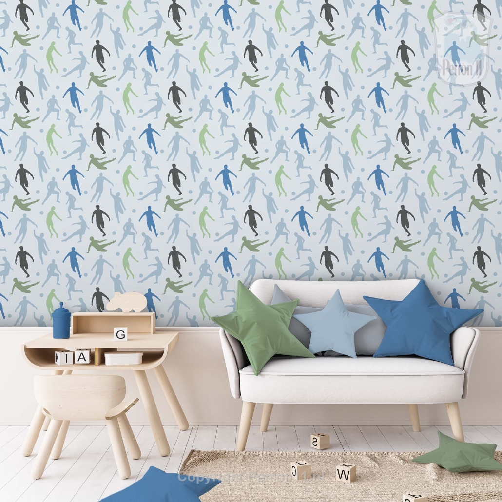 Stoer voetbalbehang voor de jongenskamer in verschillende kleuren. Het voetbalbehang heeft een patroon van 54 cm hoog dat naadloos over de baan doorloopt. Met dit voetbal behang maak je een coole voetbalkamer, waar zowel jouw voetballende zoon, als jijzelf blij van wordt! Het voetbalbehang is er momenteel in de kleurstellingen lichtblauw met groen, donkerblauw en beige.
