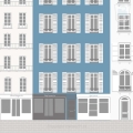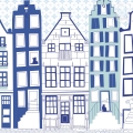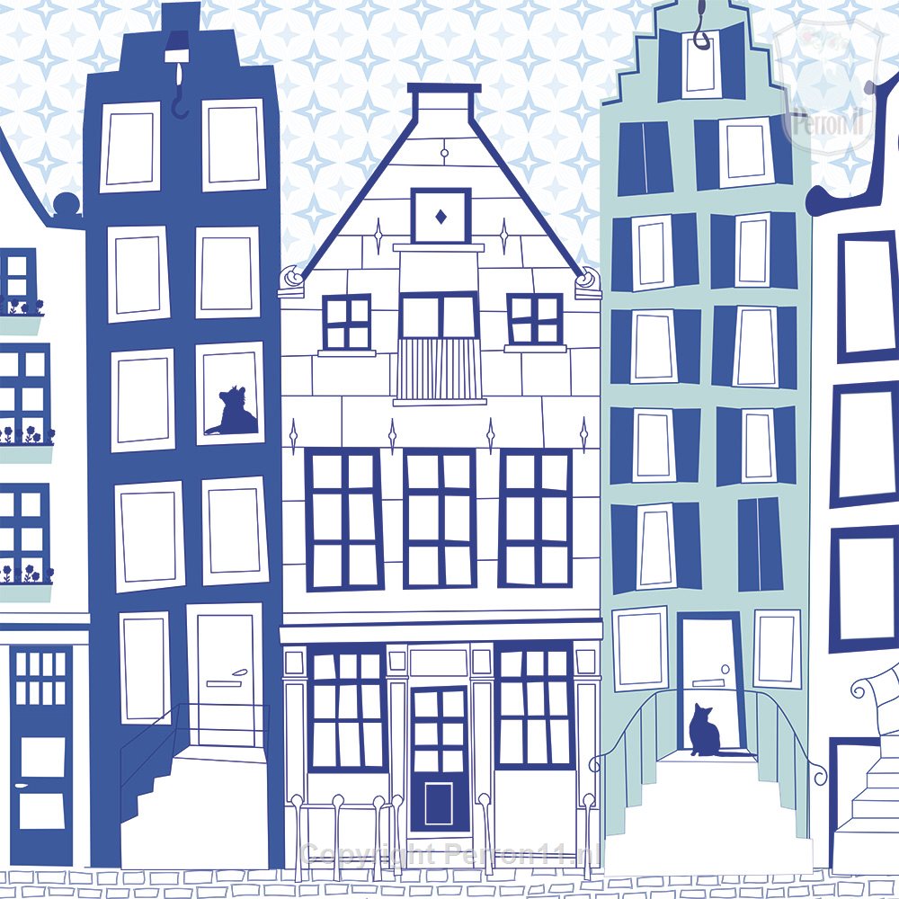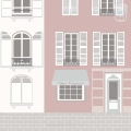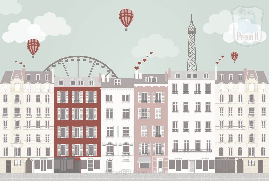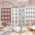 Op dit moment hebben we drie kleurkeuzes voor dit behang Parijs. Het huizenrijtje van het roze en het mintgroene behang heeft op beide kleurvariaties dezelfde kleurstellingen, op één huisje na. Op het blauwe behang zijn de huisjes iets neutraler grijs en staat er een blauw en groen huisje.