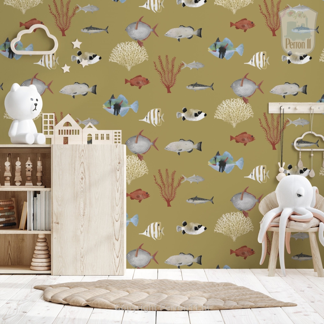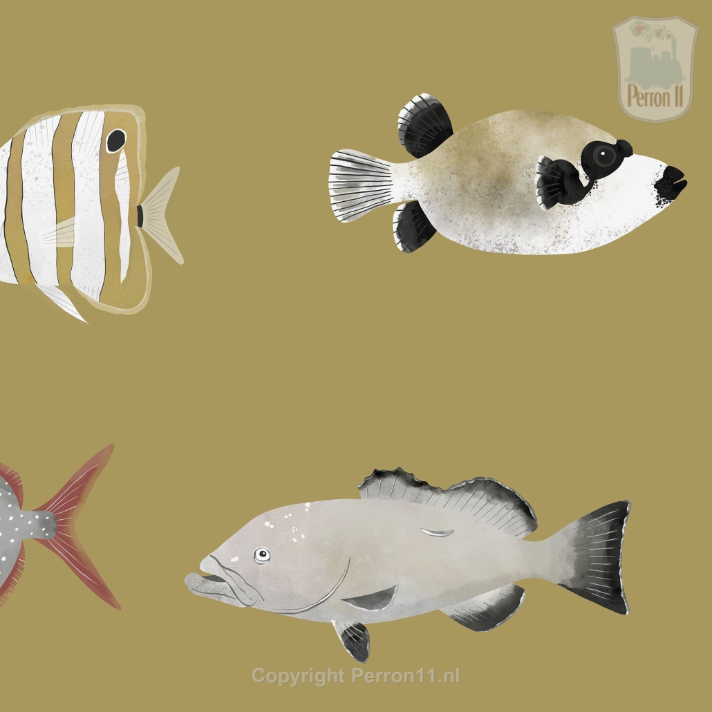 Op dit patroonbehang staat vol met grote, vrij gedetailleerd geschilderde vissen, wat de kinderkamer een leuk speels en bijzonder sfeertje geeft. Supermooi voor een babykamer of kinderkamer met onderwater thema. Wil je helemaal uitpakken, dan combineer je dit vissen patroonbehang met ons fotobehang Onderwaterwereld dat er perfect bij past (let op: de kleuren groen en oker matchen niet met het fotobehang, de andere kleuren wel!) Welke kleur kies jij?