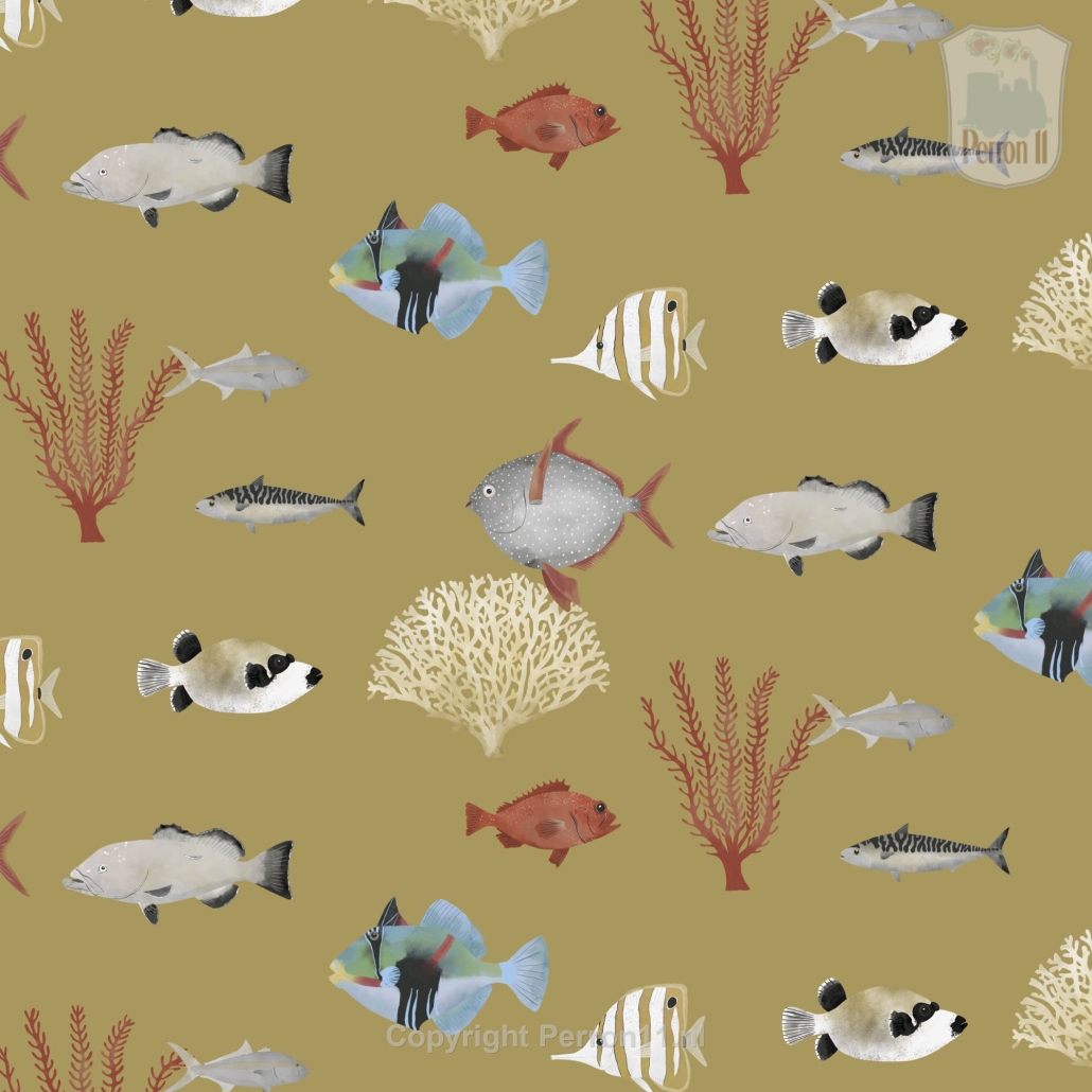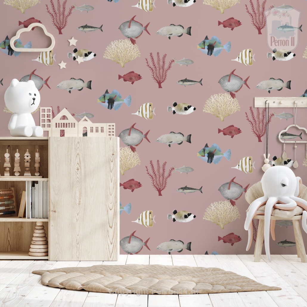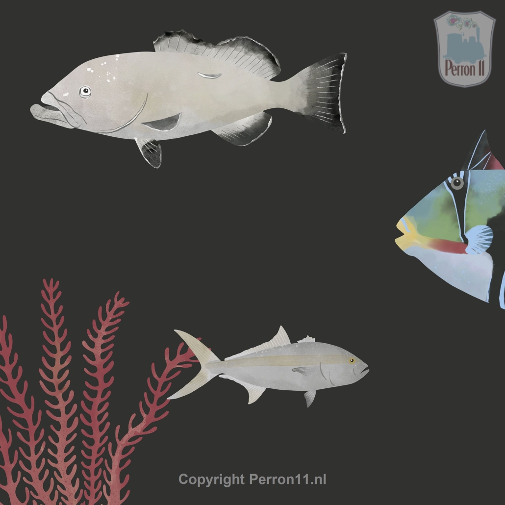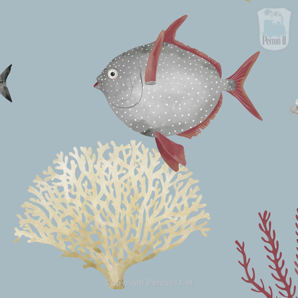 Let op: op de bijpassende behangmural Onderwaterwereld zijn het koraal en de redfish rood. De designs met oranje matchen daar daarom niet mee. Wil je toch de oker of groene versie met de behanmural combineren? Bestel de behangmural dan met de optie 'aangepaste kleur', dan laat ik ze matchen! De blauwe, bruine en roze kleurstellingen van dit vissen patroonbehang matchen wel perfect met de onderwater behangmural!