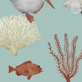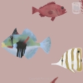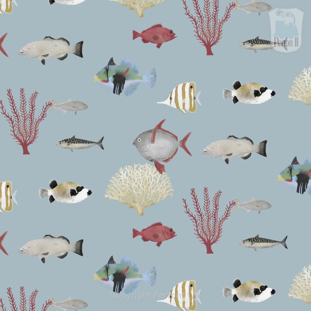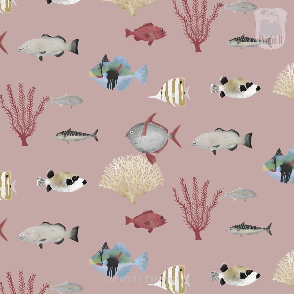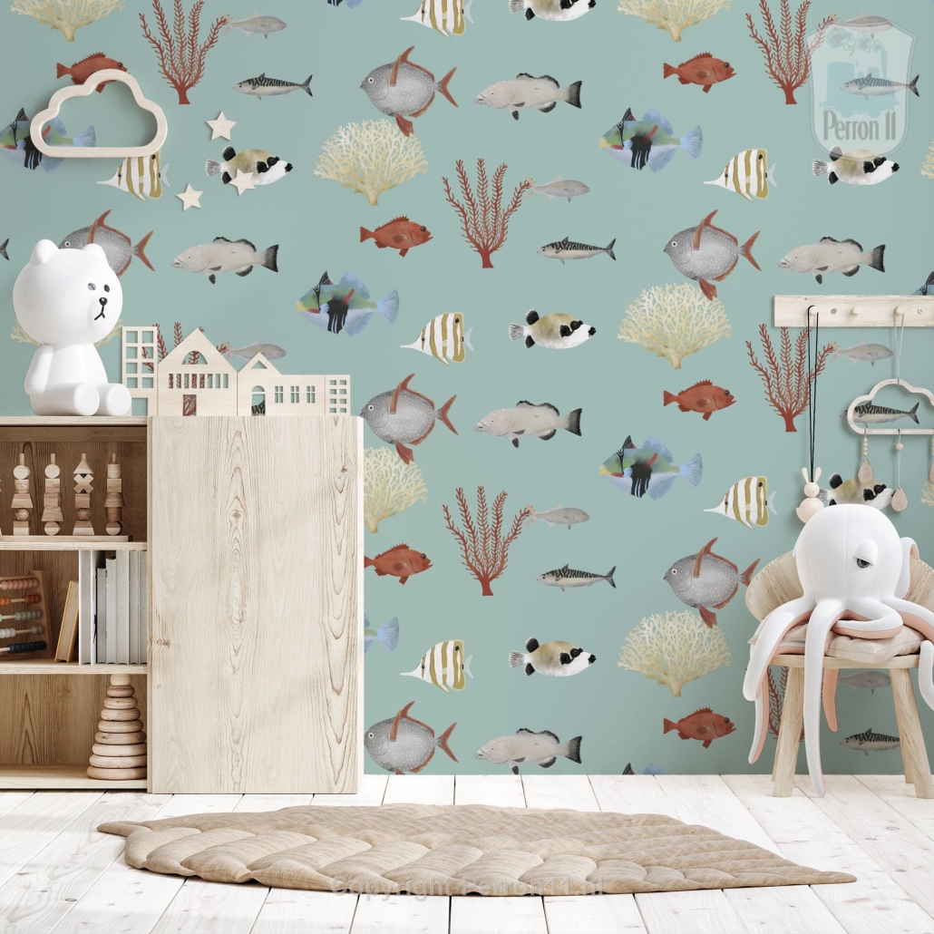 Let op: op de bijpassende behangmural Onderwaterwereld zijn het koraal en de redfish rood. De designs met oranje matchen daar daarom niet mee. Wil je toch de oker of groene versie met de behanmural combineren? Bestel de behangmural dan met de optie 'aangepaste kleur', dan laat ik ze matchen! De blauwe, bruine en roze kleurstellingen van dit vissen patroonbehang matchen wel perfect met de onderwater behangmural!