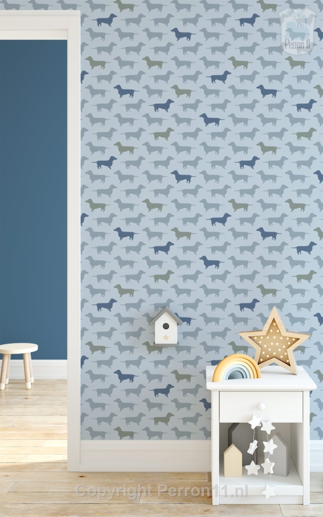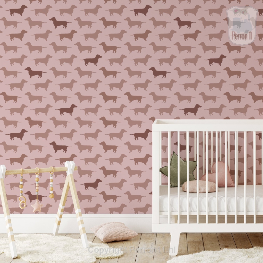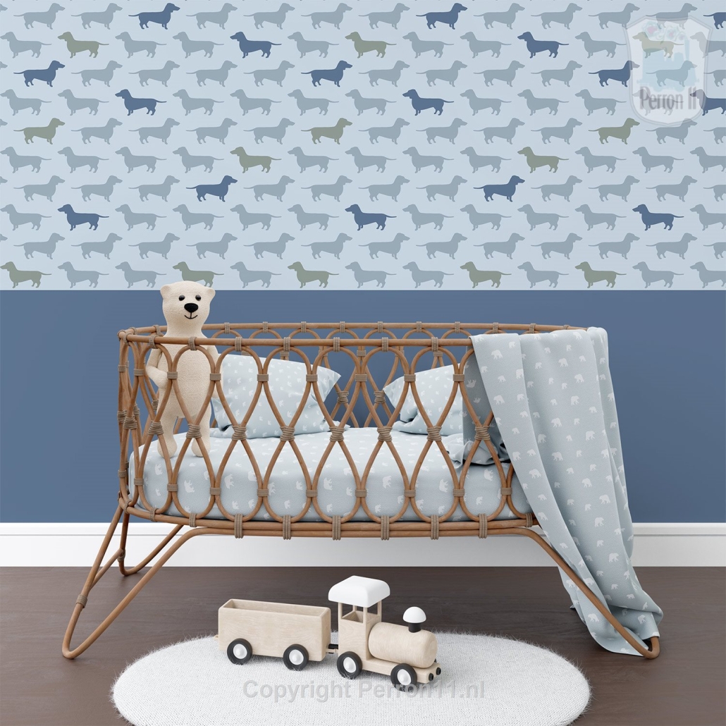 Een vrolijke kinderkamer of babykamer met dit teckel behang