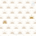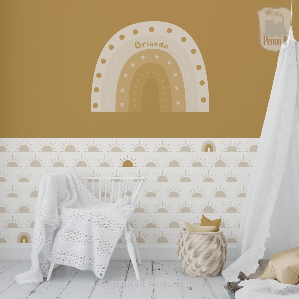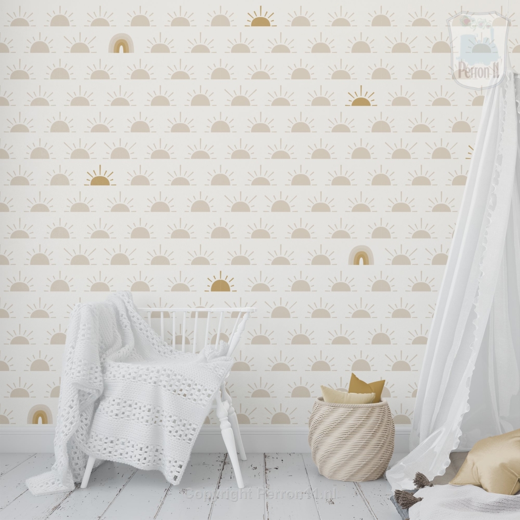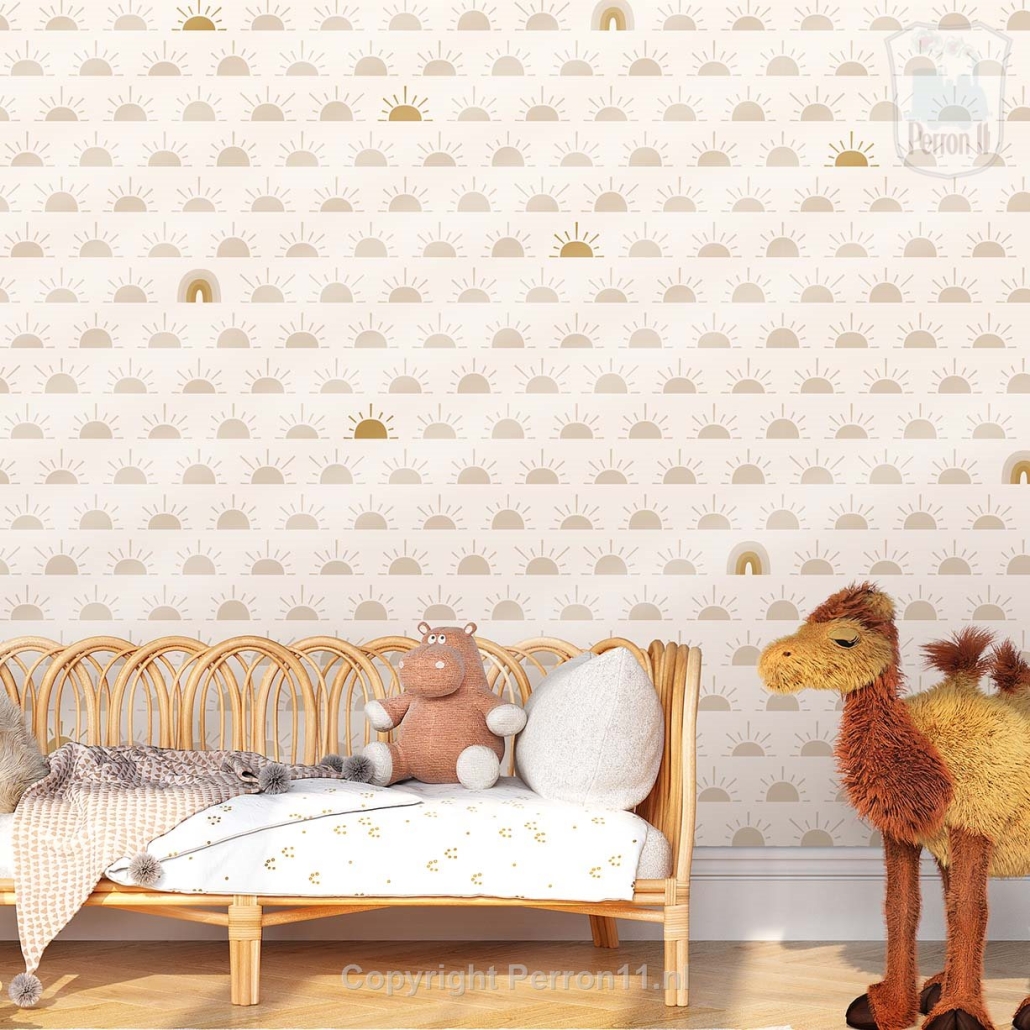 De beige - okergele variant van dit behang Zon en Regenboog is zowel geschikt voor de jongens- als meisjeskamer. Daarmee is dit dus ook een leuk behangetje dus voor de neutrale babykamer! De beige zonnetjes zitten op een cremekleurige achtergrond. Ook op dit behang verspringen de okergele zonnetjes en regenbogen over de wand. Het regenboogje verloopt van oker naar beige.