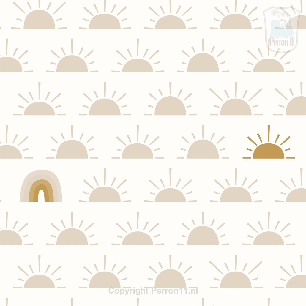 Van dit zonnetjesbehang word je toch instant vrolijk? Op dit kinderbehang Zon en Regenboog poppen tussen de zonnetjes hier en daar een regenboogje op. Leuk voor de babykamer of peuterkamer, maar ook voor de tienerkamer of een andere ruimte in huis. Dit behang is verkrijgbaar in drie kleurvariaties: oud-roze met roestkleur, beige met oker geel en blauw met roestkleur.