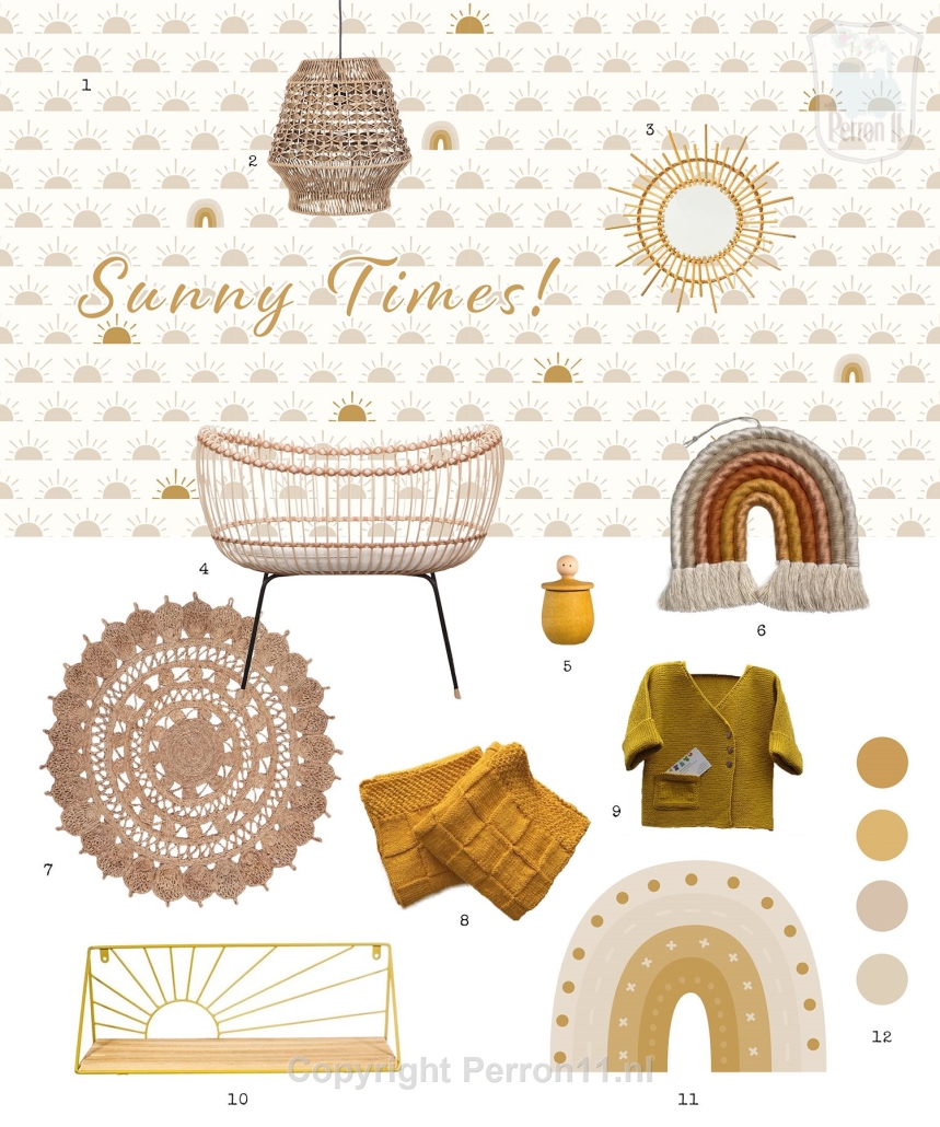 Bekijk dit beeldblog en zie welke verfkleuren en zonnige accessoires leuk staan bij ons behang Zon en Regenboog beige / okergeel.