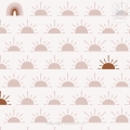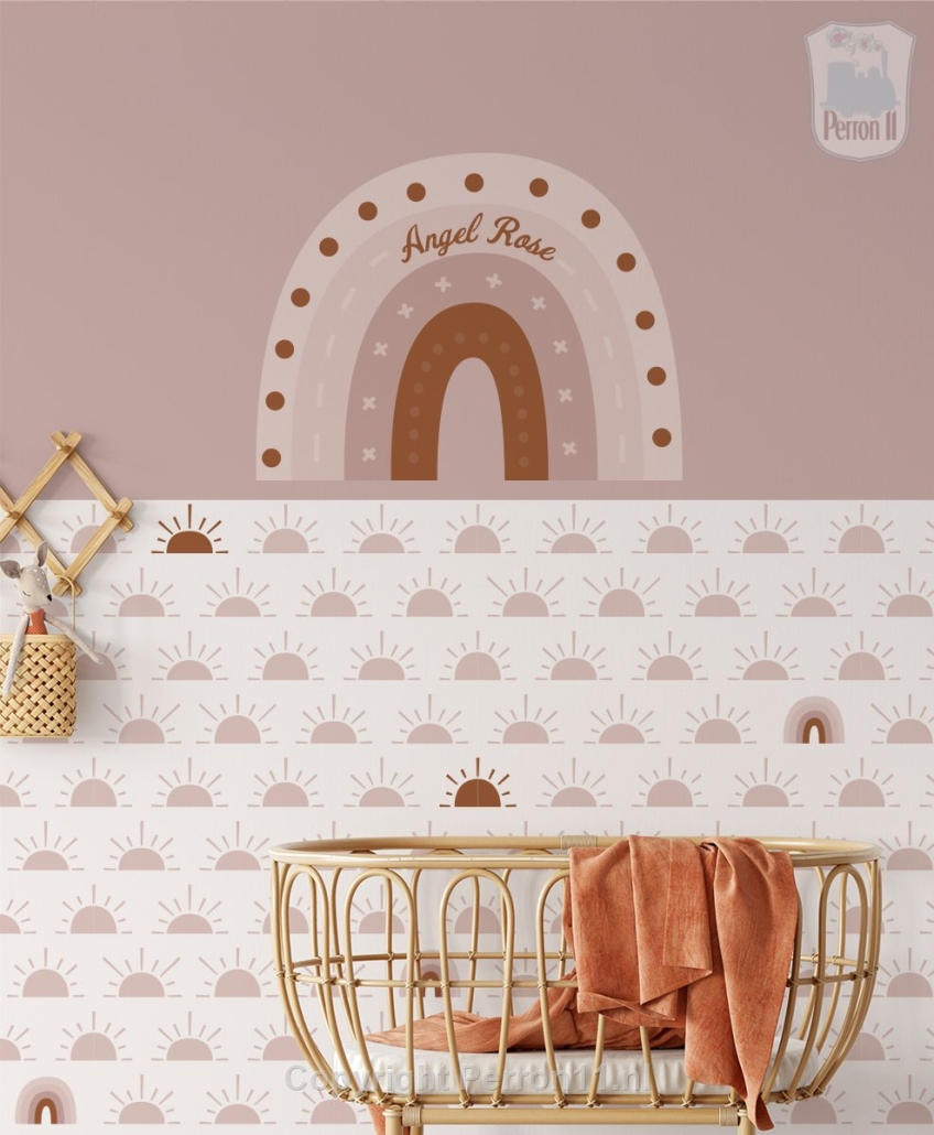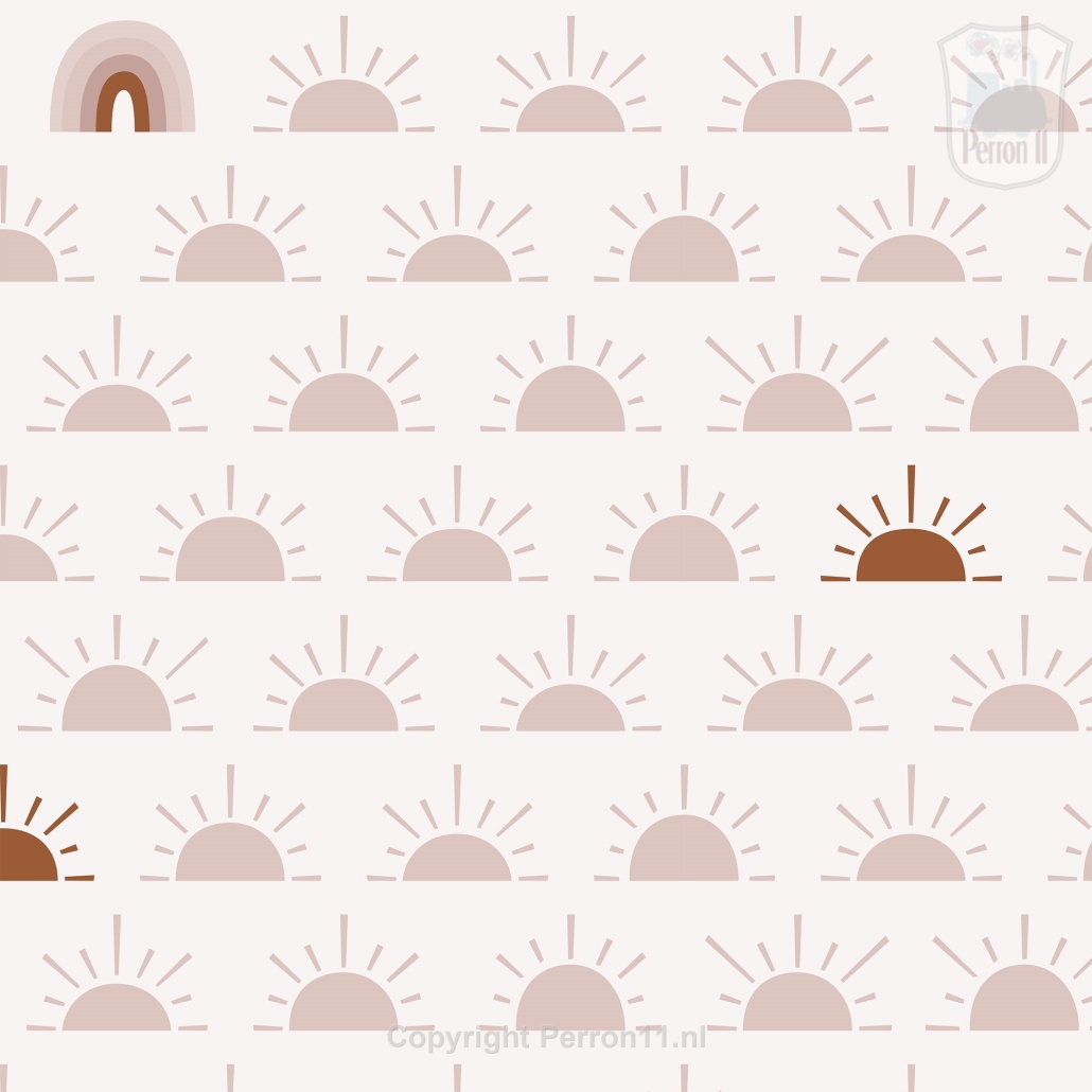 De roze - roestbruine versie van dit kinderbehang Zon en Regenboog is een heel fijn behangetje voor de meisjeskamer. Het oud roze maakt het behang lekker meisjesachtig, terwijl de roestkleur ervoor zorgt dat het niet te zoet wordt. Bovendien is deze kleur helemaal van nu. Het behang heeft een heel licht oudroze achtergrond. De roestkleurige zonnetjes en regenbogen zitten mooi verdeeld over het behang, zodat de print nooit saai wordt.