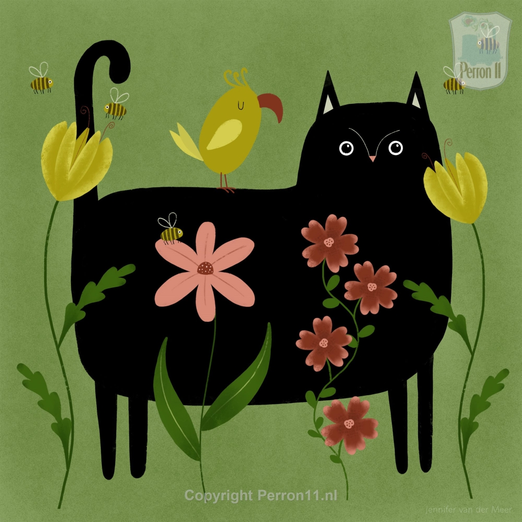 Deze kattenposter is één van de illustraties die ik maakte in een serie van maar liefst 100 kattenillustraties. Uit deze serie heb ik nu een aantal kattenillustraties geselecteerd en die zijn nu verkrijgbaar als poster! Op alle posters speelt een kat de hoofdrol, soms met een ander dier of bijvoorbeeld een voertuig, soms hebben ze iets aan, soms doen ze iets of zijn ze iets van plan. Mijn katten zijn in elk geval altijd lekker speels en vaak een beetje ondeugend. Zo loopt de kat op deze poster door de bloementuin en is er zomaar een vogel op zijn rug gaan zitten. Zo zijn alle illustraties kleine verhaaltjes en jouw kind mag dat verhaaltje verder invullen.