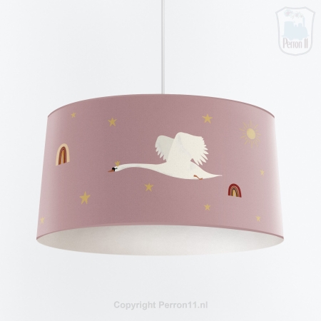 Deze dromerige kinderlamp met vliegende zwanen geeft je kinderkamer een magisch sfeertje. Op de lampenkap staan twee witte zwanen en een zwarte op een mooie oudroze achtergrond met sterretjes, zonnetjes en regenbogen. De lampenkap is 25 cm hoog, de doorsnede is 40 cm. Deze lamp behoort tot de collectie Dream of the Swans. Hij is dus superleuk te combineren met alle behangetjes of de wandcirkel uit deze collectie. Onderaan vind je de hele collectie. De kleur van het snoer en het biesje dat de kap boven en onder afwerkt bepaal je zelf. Ook kun je kiezen voor een andere binnenzijde. Hieronder ontdek je alle mogelijkheden.