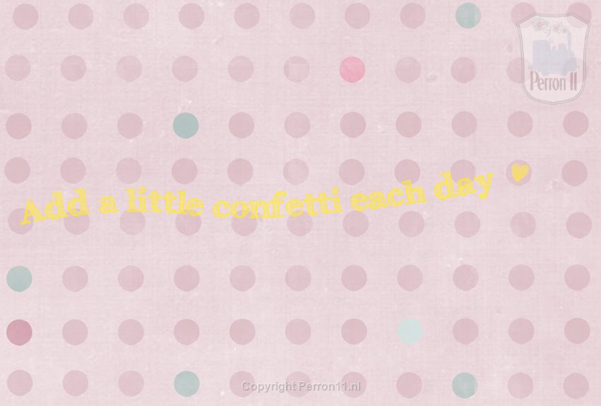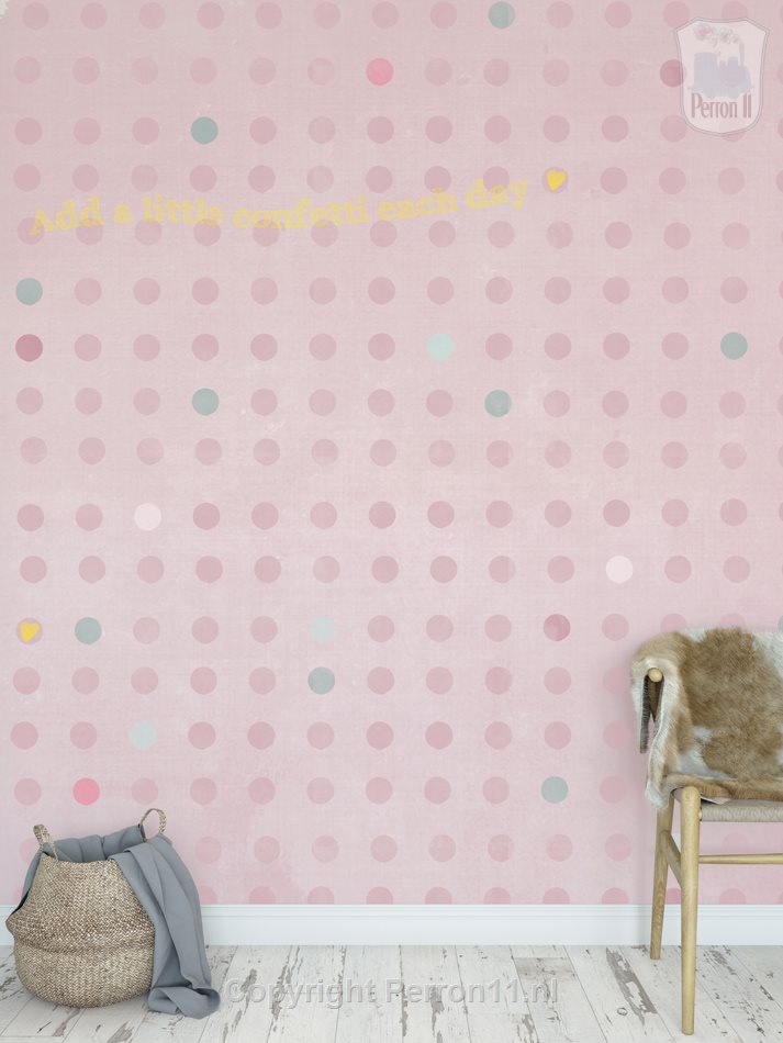 Van stippen en confetti word je vrolijk! Dit roze fotobehang met stippen en de quote 'Ad a little confetti each day' is speciaal ontworpen voor tienermeisjes. Maar ben je op zoek naar een tijdloos behang voor je babykamer of peuterkamer? Dan zit je met dit behang natuurlijk ook goed. Liever een eigen tekst of quote? Dat kan! Ook andere aanpassingen zoals maat en kleur zijn mogelijk! We hebben ook een vergrijsd groene 'standaard' versie van dit behang .