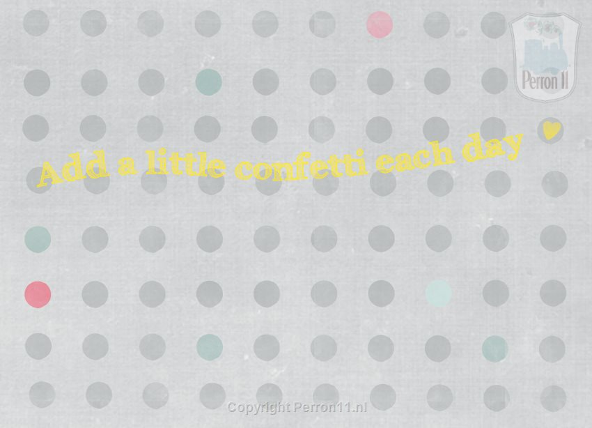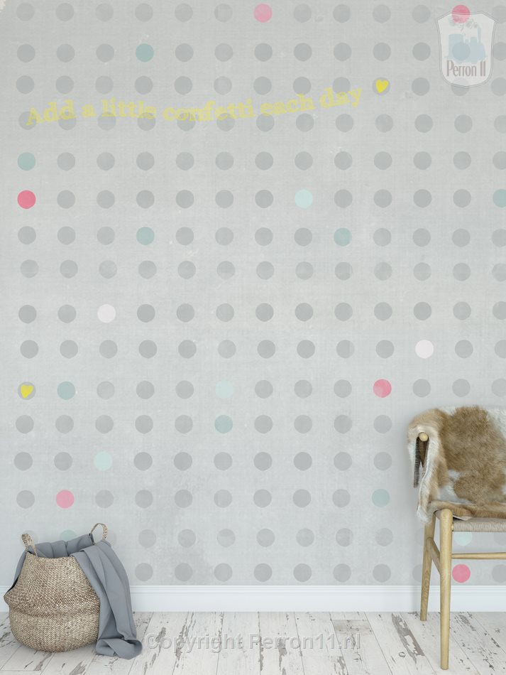 Van stippen word je vrolijk! Dit fotobehang met stippen en de quote 'Ad a little confetti each day' is speciaal ontworpen voor tienermeisjes. Maar ben je op zoek naar een tijdloos behang voor je babykamer of peuterkamer? Dan zit je met dit behang natuurlijk ook goed. Liever een eigen tekst of quote? Dat kan! Ook andere aanpassingen zoals maat en kleur zijn mogelijk! We hebben ook een 'standaard' versie van dit behang .