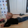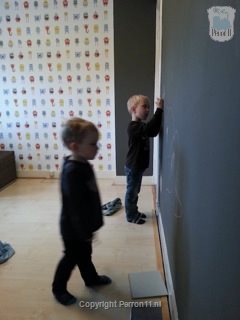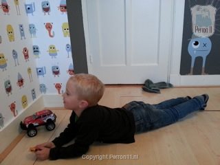 Mariska: “Jurre is echt zo ongelooflijk blij met z’n behang. Inmiddels kent hij alle monsters van het kinderbehang bij naam.”