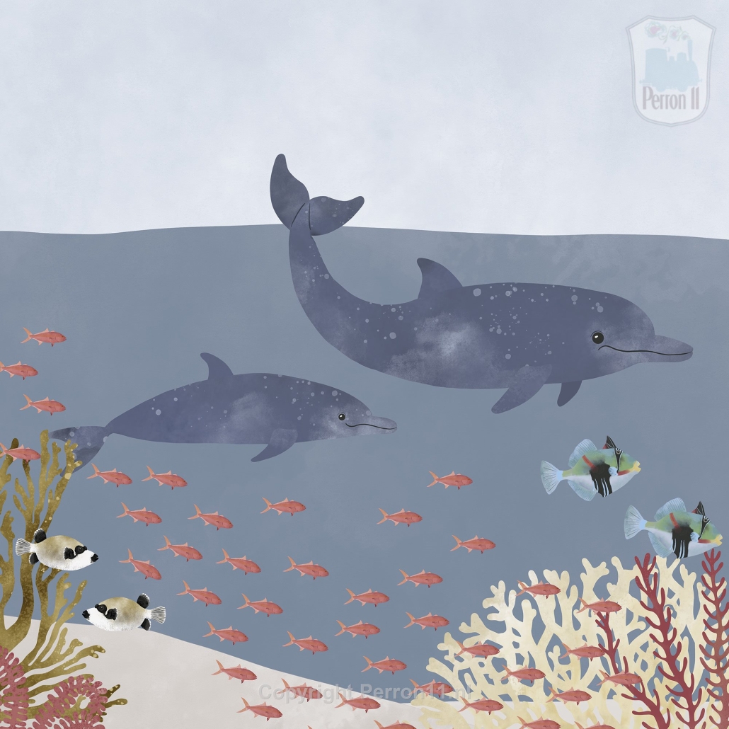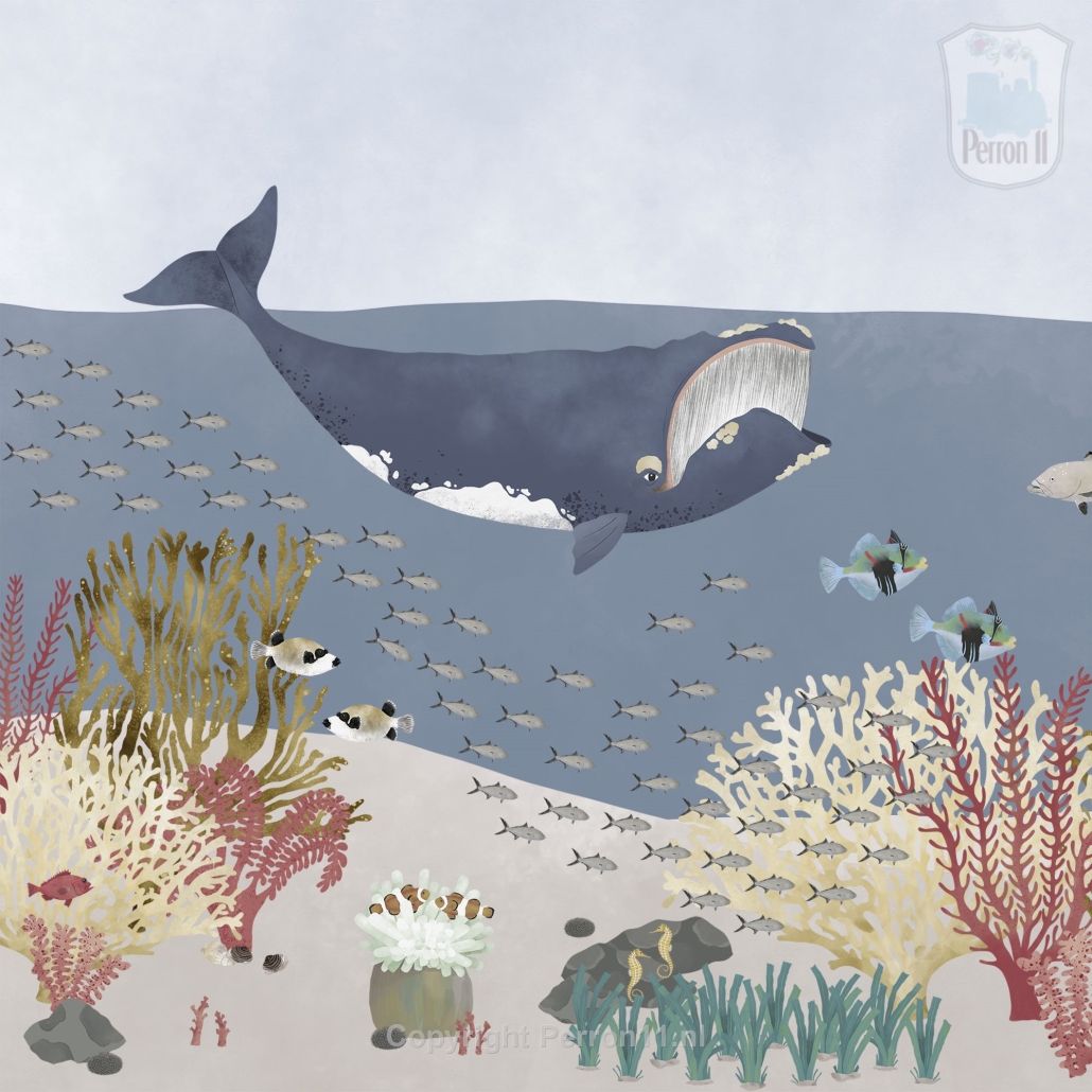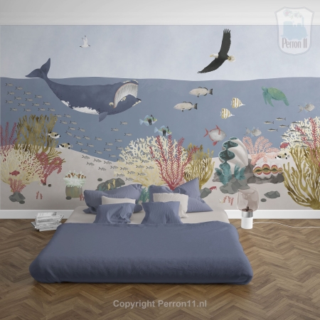 Met dit onderwaterbehang geef je jouw babykamer of kinderkamer een heel fijn en bijzonder sfeertje. De onderwaterwereld is dan ook een superleuk thema voor de kinderkamer. Zeedieren spreken kinderen erg aan en zo'n levensgrote walvis natuurlijk helemaal! Tenminste, hij kijkt natuurlijk wel een beetje stoer. De meeste, al ietsje grotere kinderen en jongens vinden dat juist erg leuk. In combinatie met de octopus, die ook wat 'grumpy' kijkt en het wrak krijg je zo een lekker stoer onderwaterbehang. Ga jij liever voor lief? Dat kan ook met dit onderwaterwereldbehang en dan kies je gewoon voor de mama- en babydolfijn en het mooie koraaleiland! Of je laat de grote zeedieren helemaal weg en dan zet ik op die plek wat mooie kleurrijke vissen. Hoe dan ook, ik maak dit onderwaterbehang zo, dat hij helemaal perfect wordt voor jouw babykamer of kinderkamer!