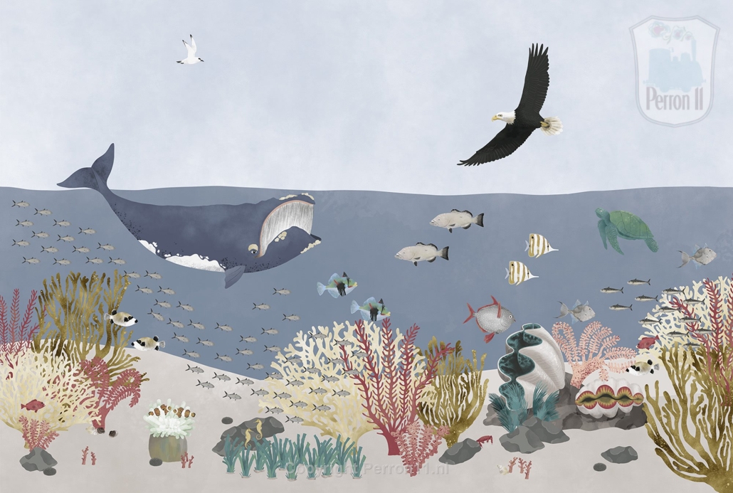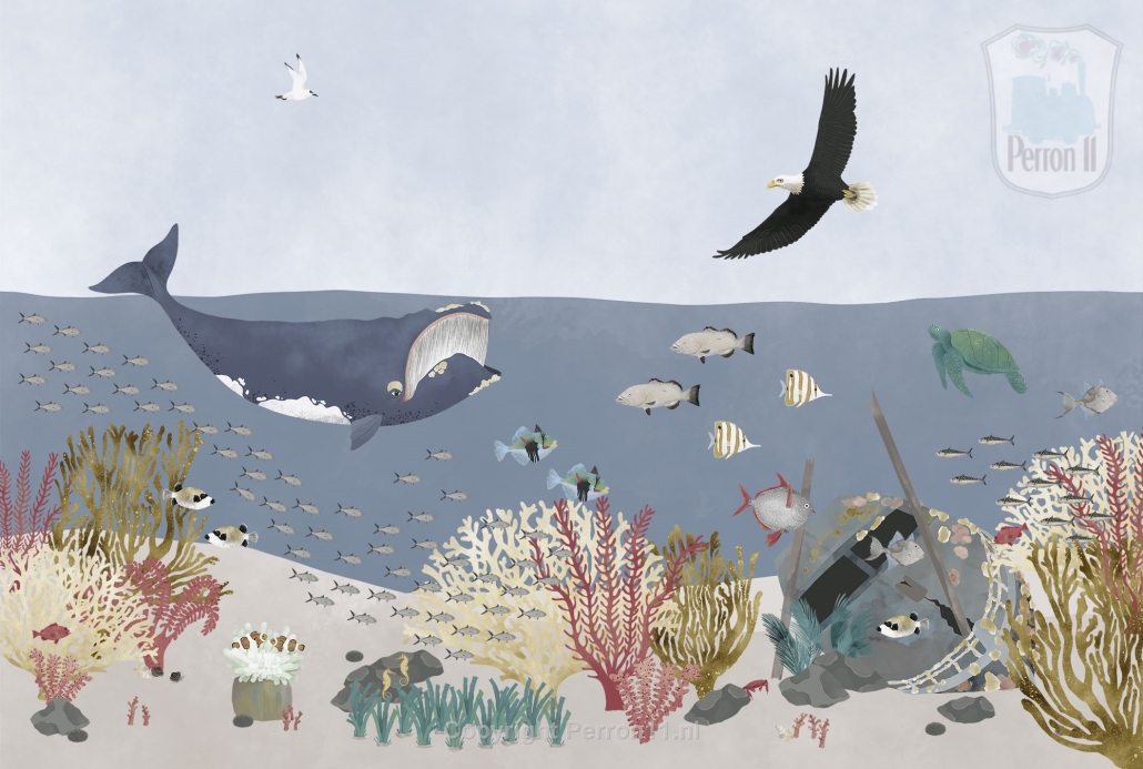 Met dit onderwaterwereld behang kun je alle kanten op! Zo kun je kiezen voor een grote, ietwat stoere walvis of lieve dolfijnen, extra koraal of juist een wrak, voor een walvis of alleen vissen, een zeearend in de lucht of niet of juist voor alle illustraties zodat je een kleurrijk behang ontstaat waarop jouw kind telkens weer wat nieuws ontdekt. Vertel mij wat je wilt, wat de maten van je wand zijn en of ik rekening moet houden met speciale dingen (denk aan een schuinlopende wand, radiator of meubels) en ik maak een uniek onderwaterwereld behang speciaal voor jouw kinderkamer! Hieronder lees je wat allemaal mogelijk is. Deze onderwaterbehang mural kun je trouwens desgewenst combineren met het onderwater patroonbehang vissen .