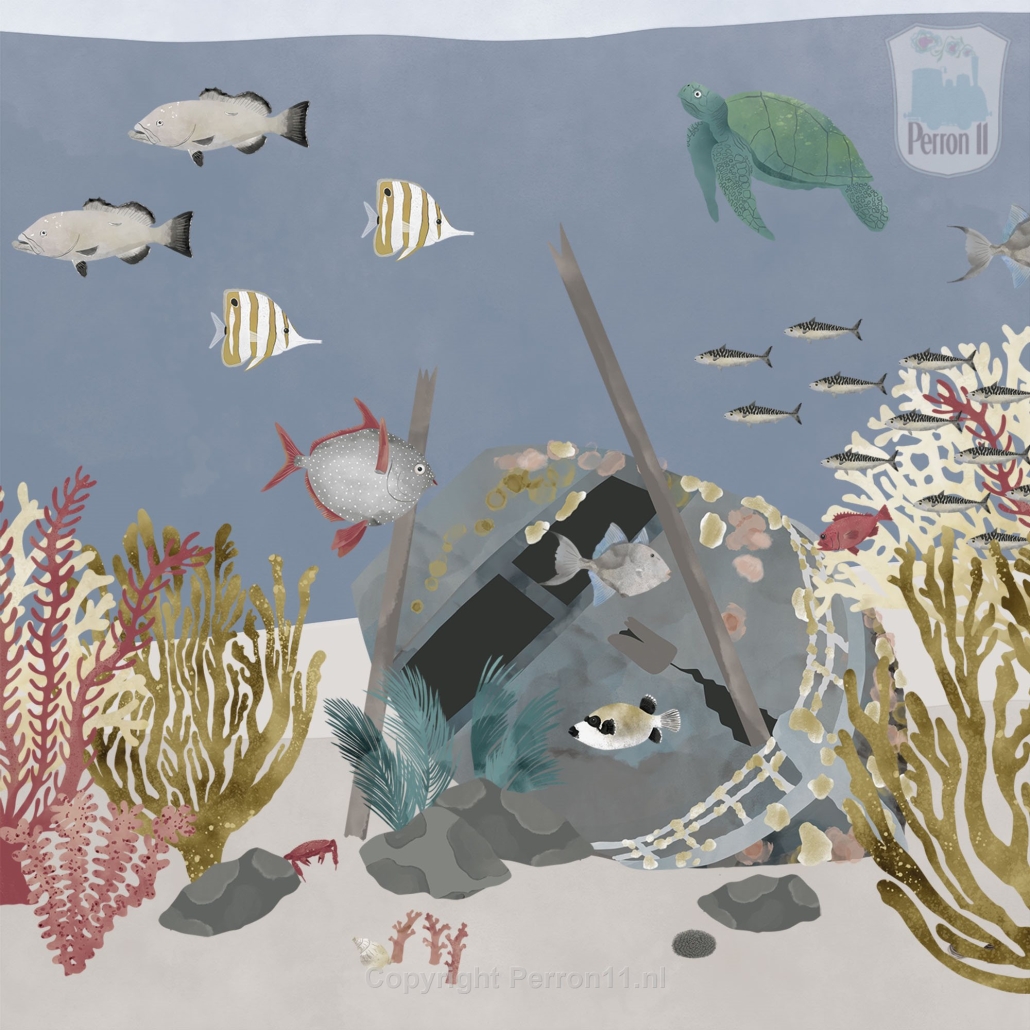 Heeft jouw kind een favoriet zeedier of een favoriete zeevogel? Dan kan ik die ook speciaal voor jullie tekenen en op het behang plaatsen. Wil je dat, plaats dan behalve dit onderwaterbehang ook een maatwerkillustratie of meerdere maatwerkillustraties in je winkelmandje en vertel me in het toelichtingenvak wat je in gedachten hebt. Je krijgt dan eerst een schetsvoorstel en daarna een proefotnwerp te zien. LET OP: kies je voor een maatwerkillustratie, reken dan op circa 1 week extra levertijd!