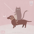 Deze kattenposter is één van de illustraties die ik maakte in een serie van maar liefst 100 kattenillustraties. Uit deze serie heb ik nu een aantal kattenillustraties geselecteerd en die zijn nu verkrijgbaar als poster! Op alle posters speelt een kat de hoofdrol, soms met een ander dier of bijvoorbeeld een voertuig, soms hebben ze iets aan, soms doen ze iets of zijn ze iets van plan. Mijn katten zijn in elk geval altijd lekker speels en vaak een beetje ondeugend. Zo zit de kat op deze poster op de rug van een teckel en probeert hij het hondje te verleiden om achter het koekje aan te lopen. Zo zijn alle illustraties kleine verhaaltjes en jouw kind mag dat verhaaltje verder invullen.
