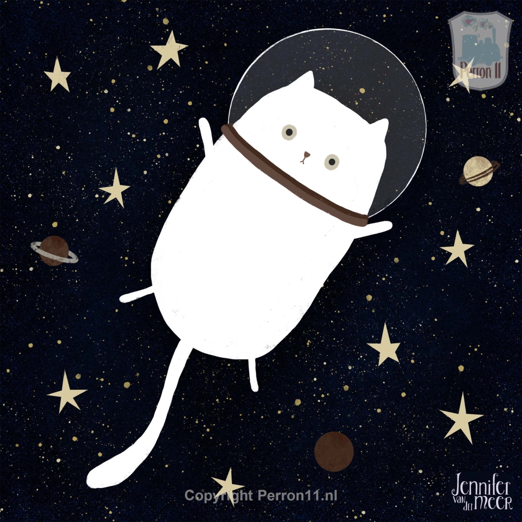 Deze kattenposter is één van de illustraties die ik maakte in een serie van maar liefst 100 kattenillustraties. Uit deze serie heb ik nu een aantal kattenillustraties geselecteerd en die zijn nu verkrijgbaar als poster! Op alle posters speelt een kat de hoofdrol, soms met een ander dier of bijvoorbeeld een voertuig, soms hebben ze iets aan, soms doen ze iets of zijn ze iets van plan. Mijn katten zijn in elk geval altijd lekker speels en vaak een beetje ondeugend. Zo maakt deze kat op de poster een ruimtewandeling. Hoe is hij in de ruimte gekomen? Zo zijn alle illustraties kleine verhaaltjes en jouw kind mag dat verhaaltje verder invullen.
