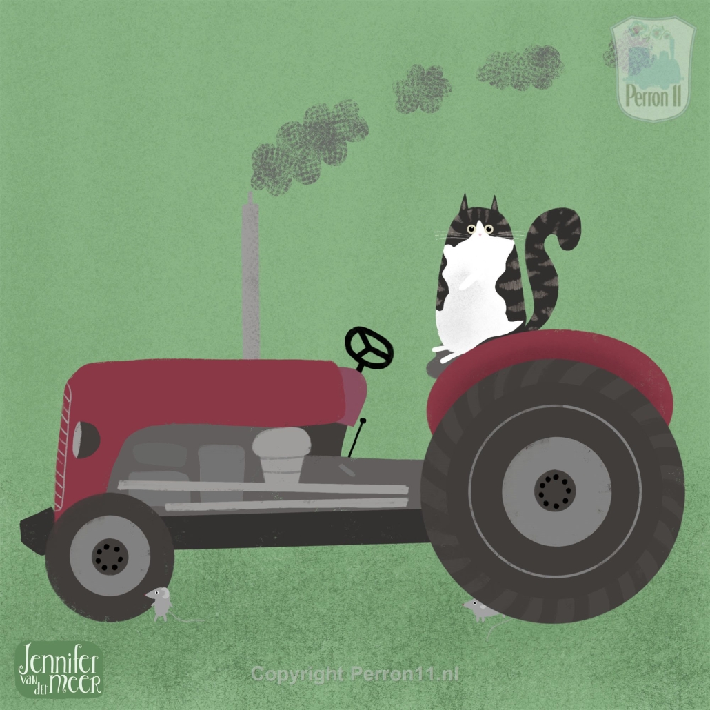Deze kattenposter is één van de illustraties die ik maakte in een serie van maar liefst 100 kattenillustraties. Uit deze serie heb ik nu een aantal kattenillustraties geselecteerd en die zijn nu verkrijgbaar als poster! Op alle posters speelt een kat de hoofdrol, soms met een ander dier of bijvoorbeeld een voertuig, soms hebben ze iets aan, soms doen ze iets of zijn ze iets van plan. Mijn katten zijn in elk geval altijd lekker speels en vaak een beetje ondeugend. Zo zit de kat op deze poster op een trekker waar de rookwolkjes al uitkomen. Rijdt de kat zo weg of wacht hij op zijn baasje? Zo zijn alle illustraties kleine verhaaltjes en jouw kind mag dat verhaaltje verder invullen. Leuk detail: voor deze kat stond mijn kater Django model die daadwerkelijk graag op onze oude Massey Ferguson uit 1954 zit!