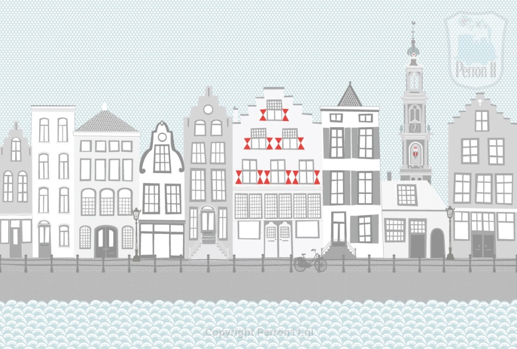 Het standaard behang bestaat uit de grachtenpandjes met de Westertoren, de gracht, een fiets en lantaarnpalen. Je ziet deze op de eerste foto. Wil je het behang rustig houden, dan kies je hiervoor. We maken het behang opmaat naar jou muur zodat het perfect past. Kies je voor een behang aangepaste kleur, dan kun bovendien kiezen voor extra illustraties op het behang. Zo maak je het nog persoonlijker.