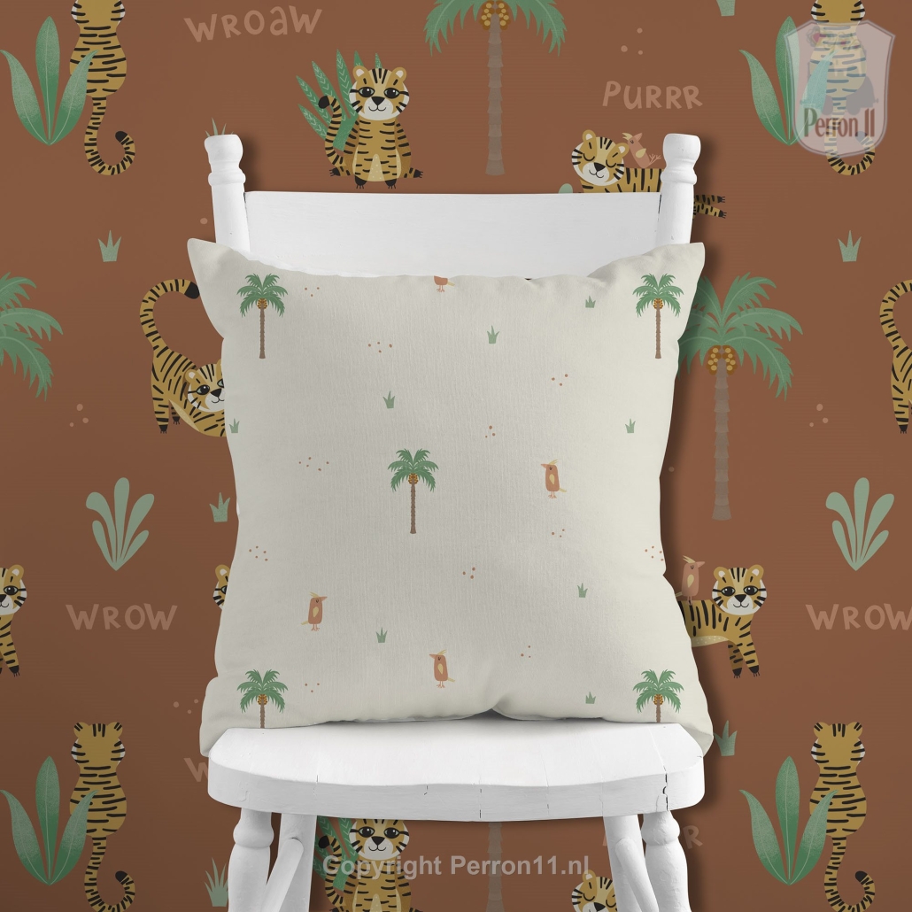 Heb jij een van onze behangetjes uit de collectie Tiger Cub op je wand? Dan is dit lieve sierkussentje een must-have om je kinderkamer helemaal af te maken! Op de ene kant staat een een illustratie van het tijgertje en zijn vogelvriendje op een copperkleurige achtergrond (in het echt is die trouwens wat lichter dan op de foto). Aan de achterkant staat een leuk patroon van het eigenwijze vogeltje met palmboompjes. Zo kun je nog eens wisselen van kant! We kunnen je tijgersierkussen uitvoeren in verschillende materialen. Scrol voor uitleg naar beneden. Helemaal onderaan de pagina staan alle bijpassende items uit de collectie Tiger Cub.