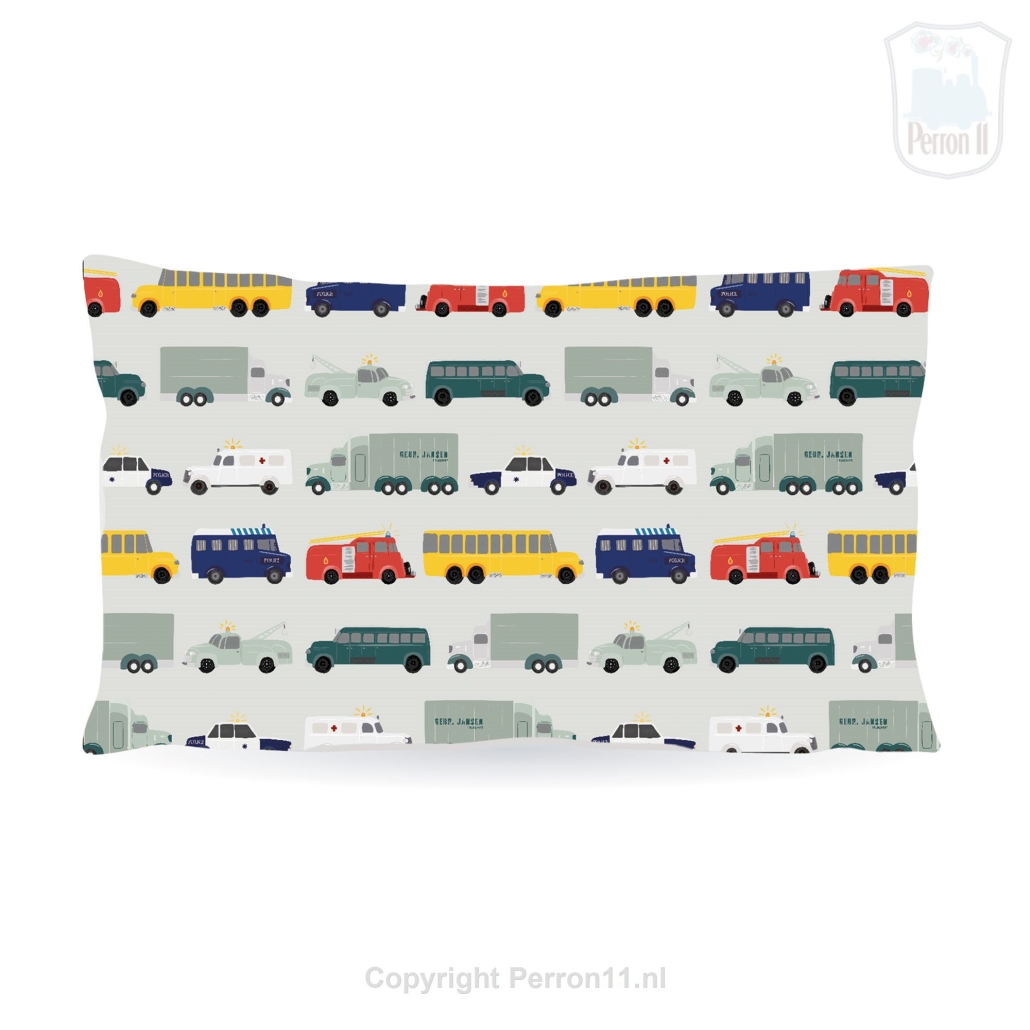 Aan de ene kant van het sierkussen staat dus een brandweerauto, aan de andere kant staat een patroon van voertuigen. Dat is hetzelfde patroon als op ons voertuigenbehang, alleen een stuk kleiner. Dit maakt het behang en het sierkussen leuk te combineren!