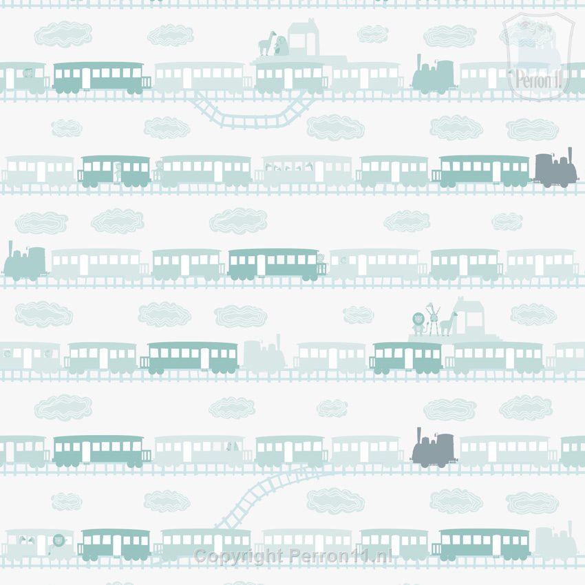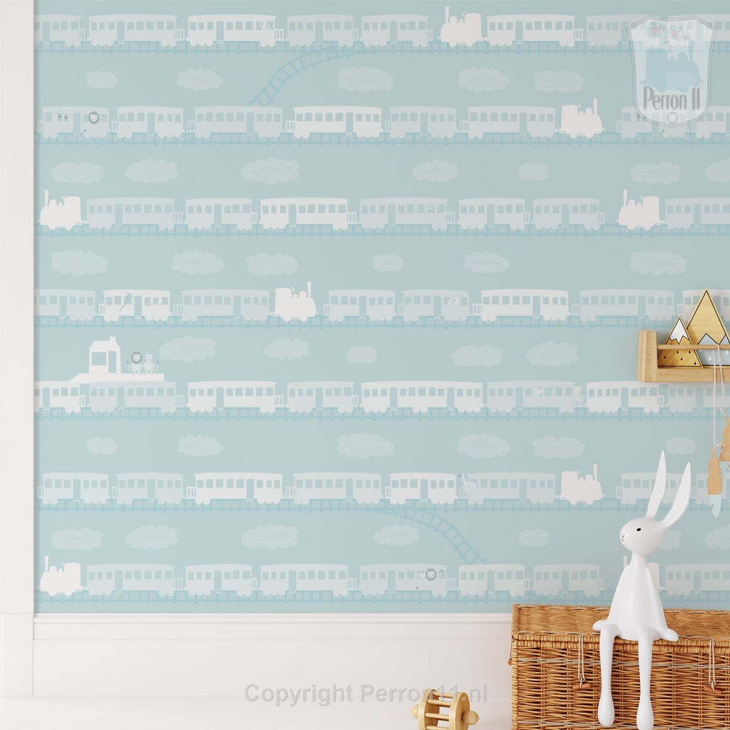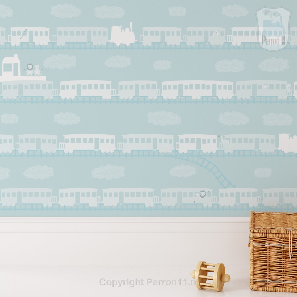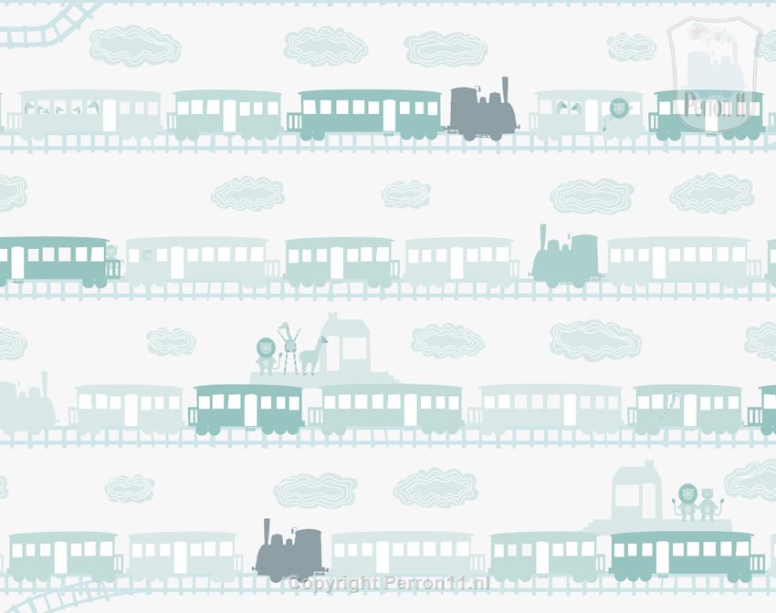 Dit treintjes behang is momenteel verkrijgbaar in mint groen en licht blauw.