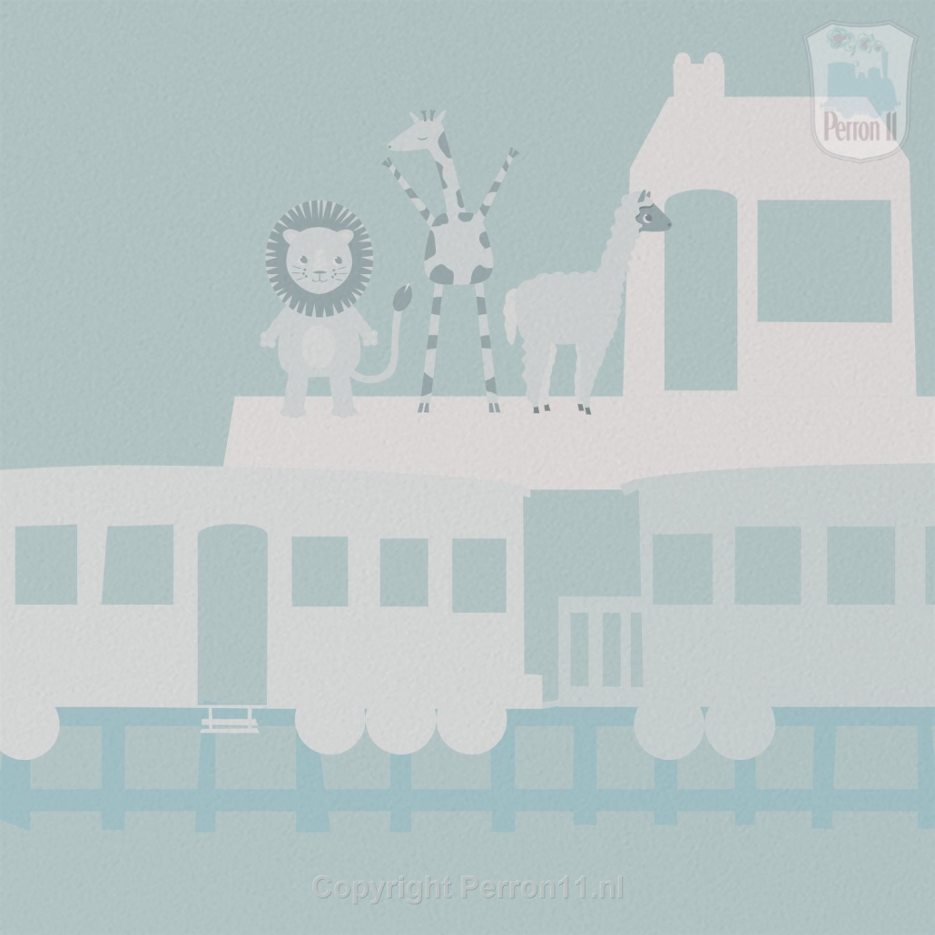 Het licht blauwe treintjes behang heeft een lichtblauwe achtergrond met daarop gebroken witte en heel licht blauwe treintjes. De dieren zijn in dezelfde kleurschakeringen getekend. De rails is op dit blauwe treintjes behang iets donkerder / feller lichtblauw dan de rest. Door deze ton-sur-ton kleuren heeft dit behang een hele mooie, zachte uitstraling en geeft het de kamer een rustige sfeer terwijl er toch heel veel te zien is op het behang.