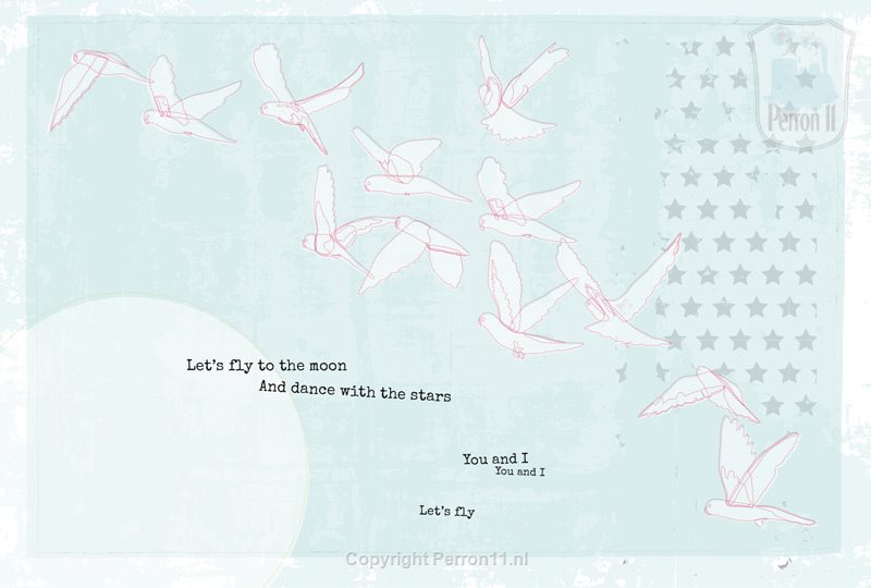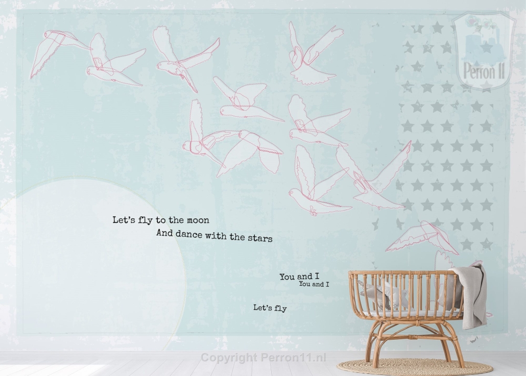 Laat je inspireren door deze aparte, prachtige zwerm vogels op de muur. Op de mural staan vogels, de maan, patronen en een gedicht. Met dit posterbehang geef je de woon-, slaap- of kinderkamer een super unieke uitstraling! De mooie zachtblauwe en grijze tinten geven een fijn sfeertje aan de kamer en zijn daardoor perfect voor de babykamer. De rode lijntjes, die op het behang gestikt lijken met een naaimachine, geven het geheel toch een beetje pit. We maken deze behangmural altijd gratis op maat van jouw wand. Ook een eigen tekst is mogelijk. De tekst helemaal weglaten? Ook dat kan!