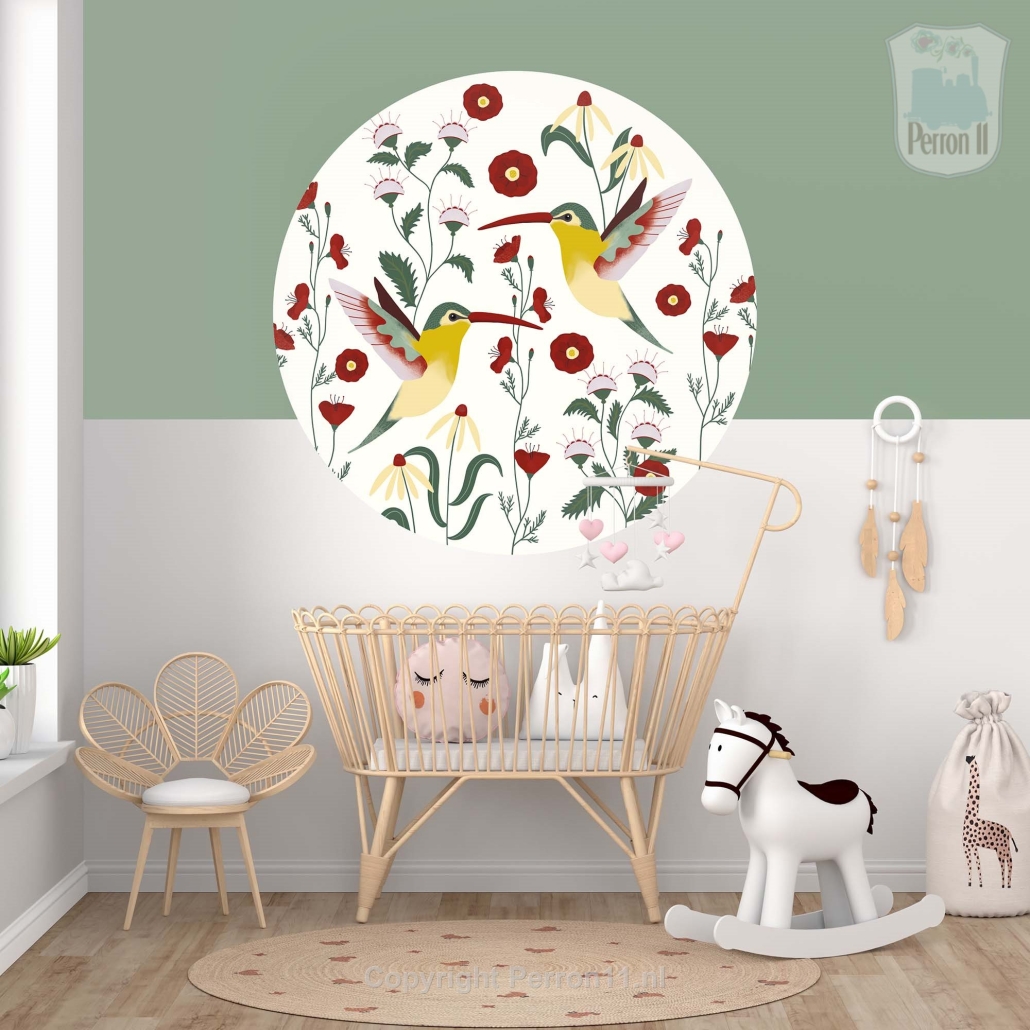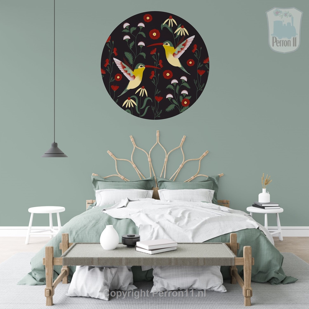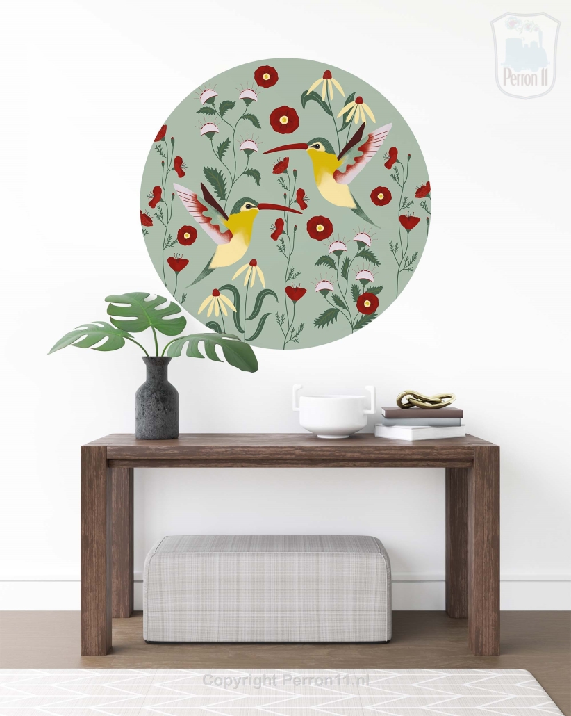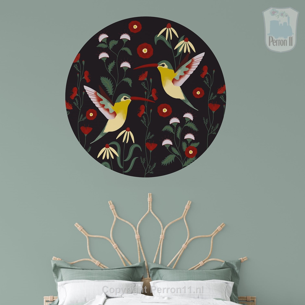 Deze wandcirkel met twee gekleurde vogels (kolibries) past niet alleen in de babykamer of meisjeskamer maar ook in elke volwassen ruimte. De wandcirkel is verkrijgbaar met verschillende achtergrondkleuren. De maat en het materiaal bepaal je bovendien zelf. Dus kies jij voor een kleine muursticker of ga je voor een groots effect van een grote wandcirkel op het prachtige dibond, waardoor je straks een echt kunstwerk aan de wand hangt? Deze wandcirkel Kolibri is onderdeel van onze collectie Poppy Flower en is daardoor perfect te combineren met een de behangontwerpen uit deze serie. Binnenkort komen er ook beddengoed en stoffen bij, dus hou de site in de gaten! De huidige bij elkaar passende ontwerpen uit de collectie vind je onderaan deze pagina.