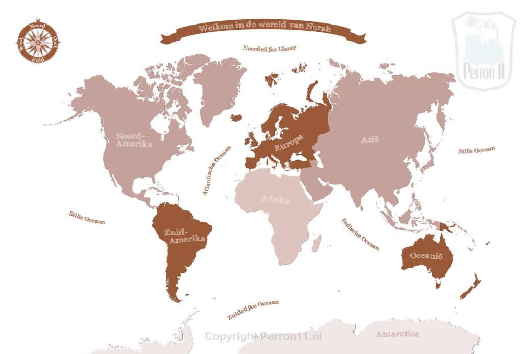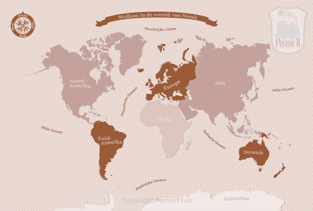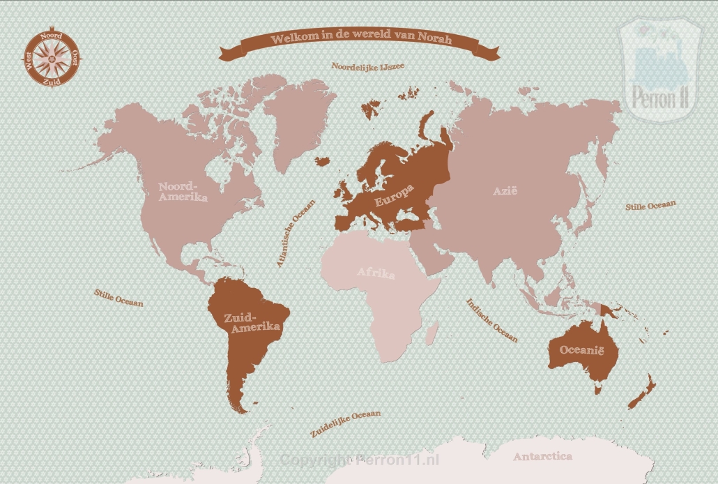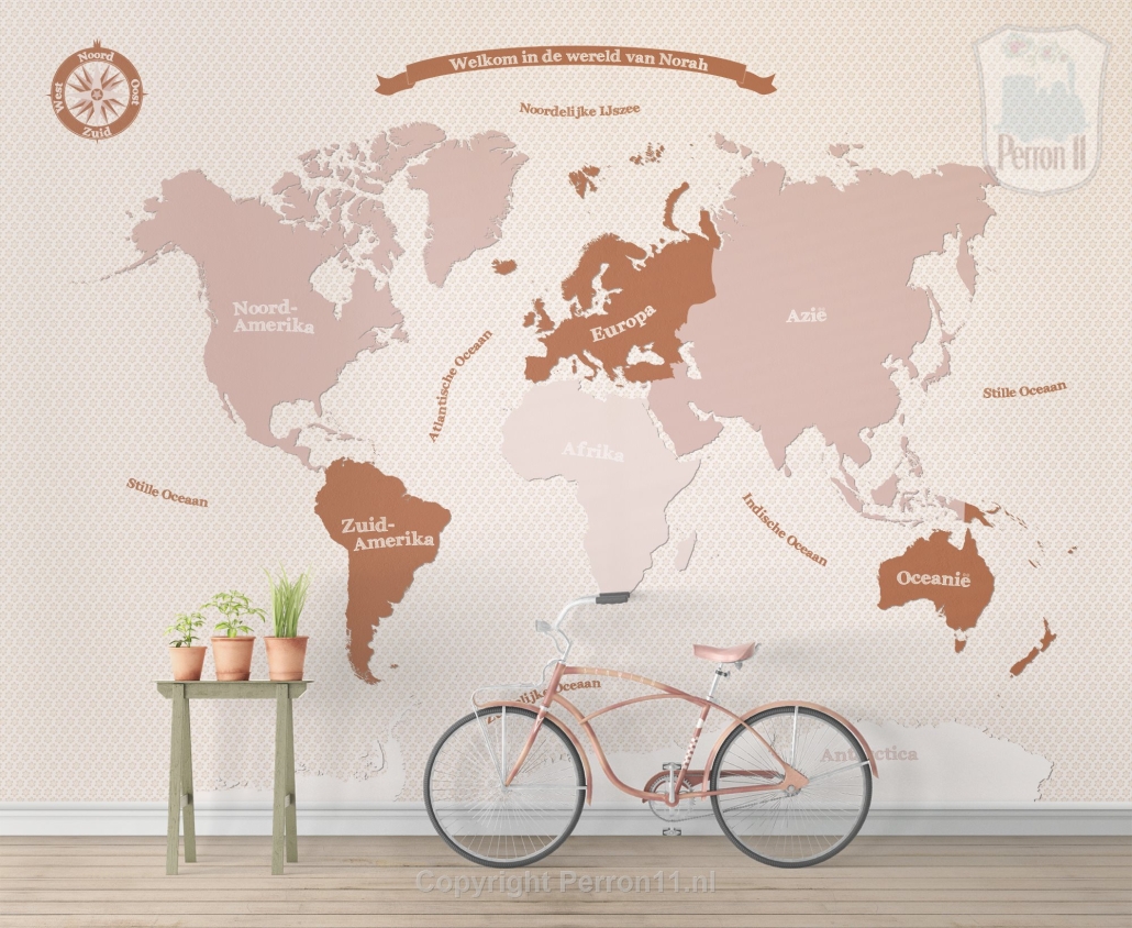 Dit wereldkaartbehang met oud roze tinten en roestbruin staat vast prachtig in jouw meisjeskamer! Je kunt kiezen voor verschillende achtergronden: vrolijke bloemetjesachtergrond in dezelfde roestkleurige tinten óf in mintgroen, ruitjespapier, een stippelpatroon of gewoon een witte of andere kleur achtergrond. Ook kun je kiezen voor een banner met naam van jouw dochter, of een mooie spreuk. Net wat jij wilt! Je kunt de banner ook weglaten of op een ander plaats laten zetten en dat geldt ook voor het compas. We maken ons behang altijd helemaal op maat voor jouw wand en naar jouw wensen.