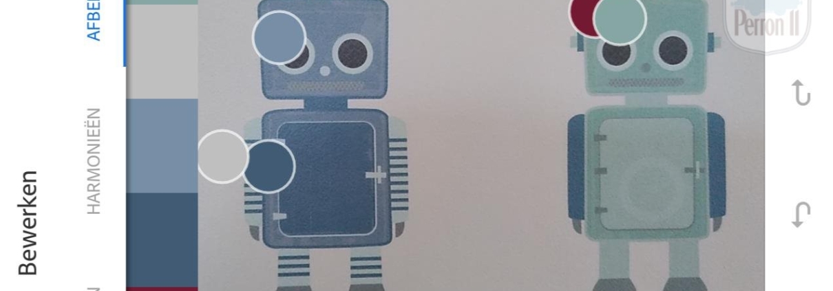 Afb.: screenshot van de app Adobe Capture, waarmee ik een foto maakte van het behang Robot van Perron 11. De app zoekt de kleuren uit het behang en geeft suggesties voor een kleurenschema dat je kunt aanpassen